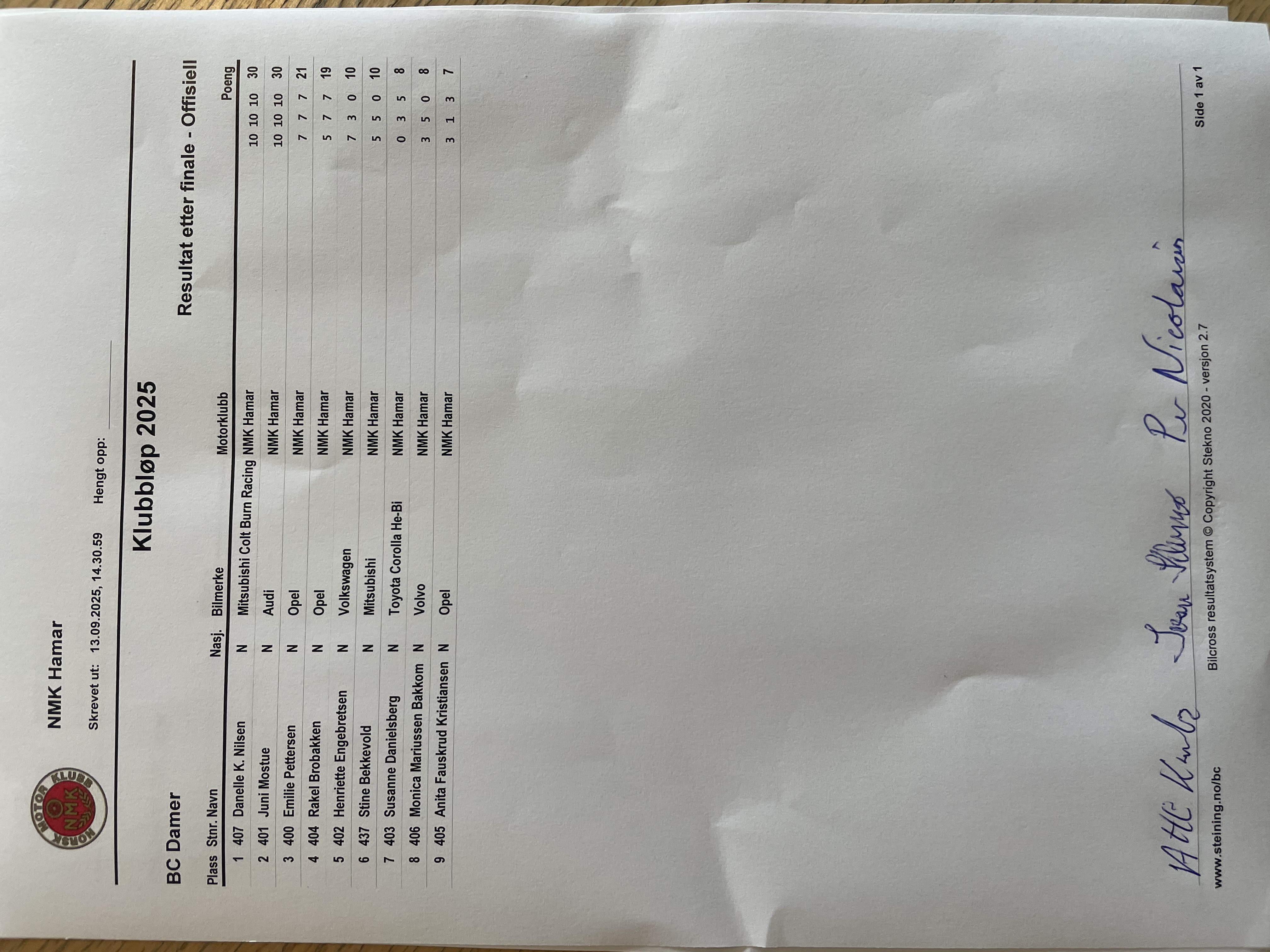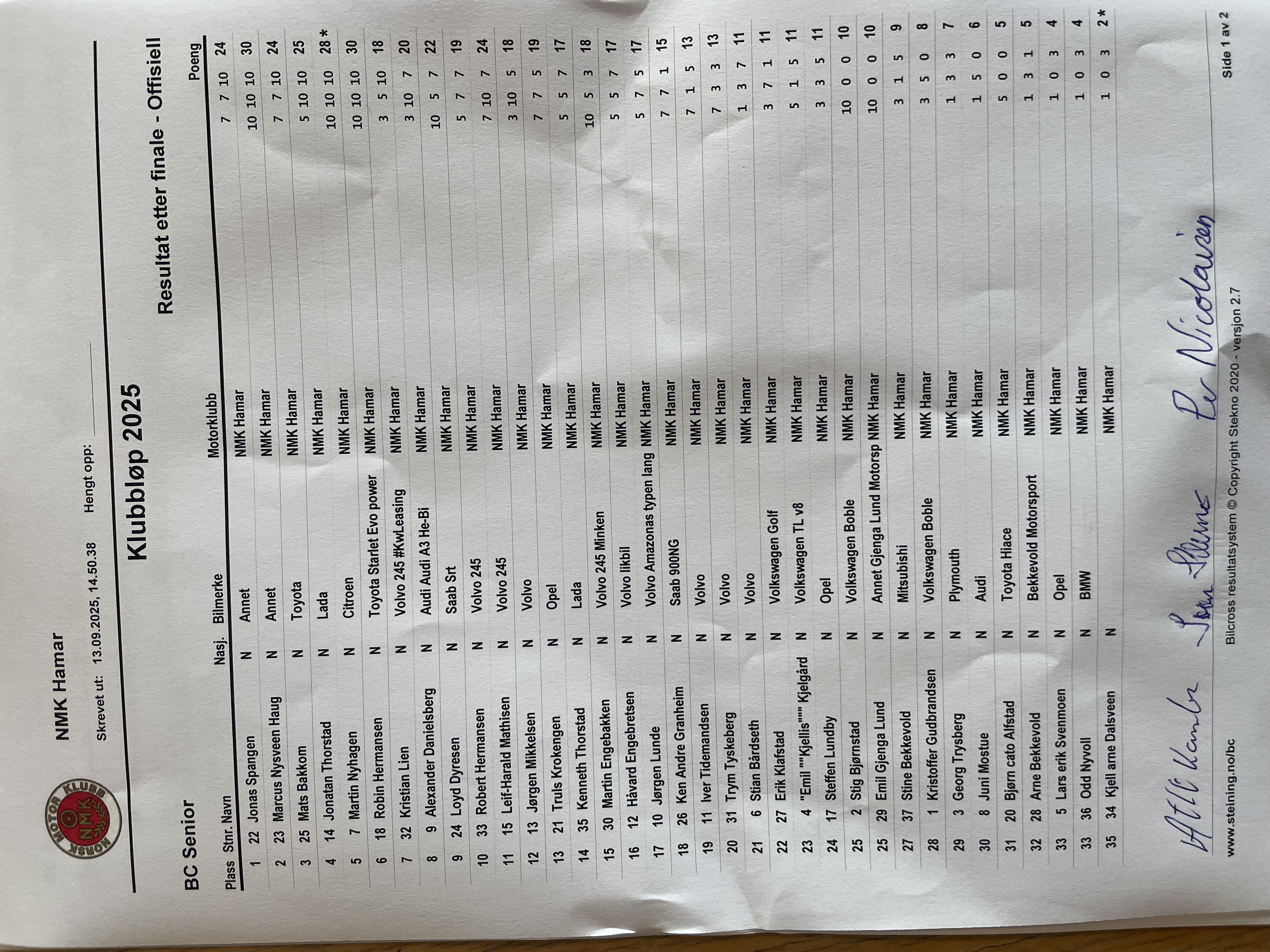 Liste over deling av bil. Ved feil gi beskjed til sekretariatet.