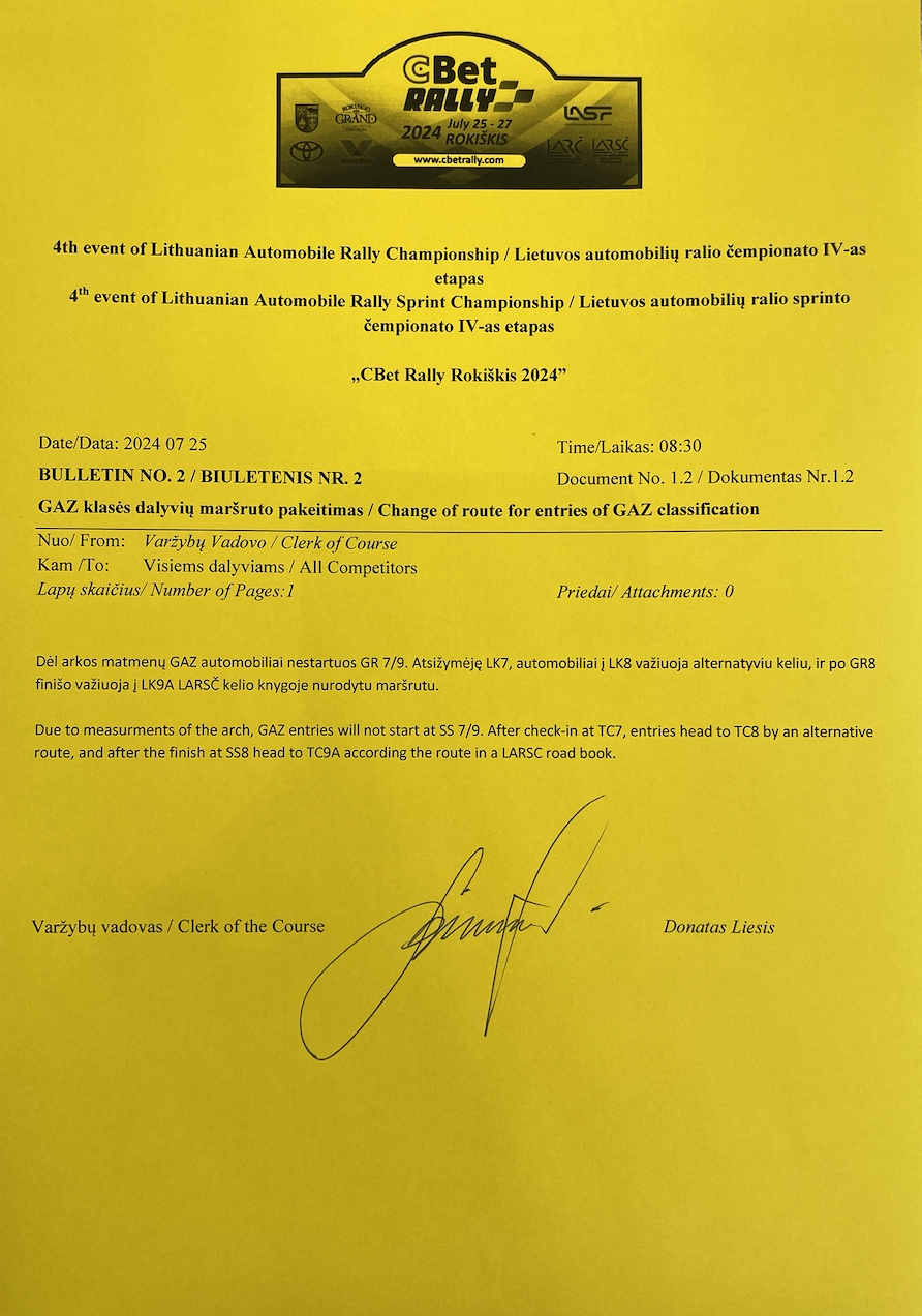 Biuletenis Nr. 2 GAZ klasės dalyvių maršruto pakeitimas | Bulletin No.2 Change of route for entries of GAZ classification