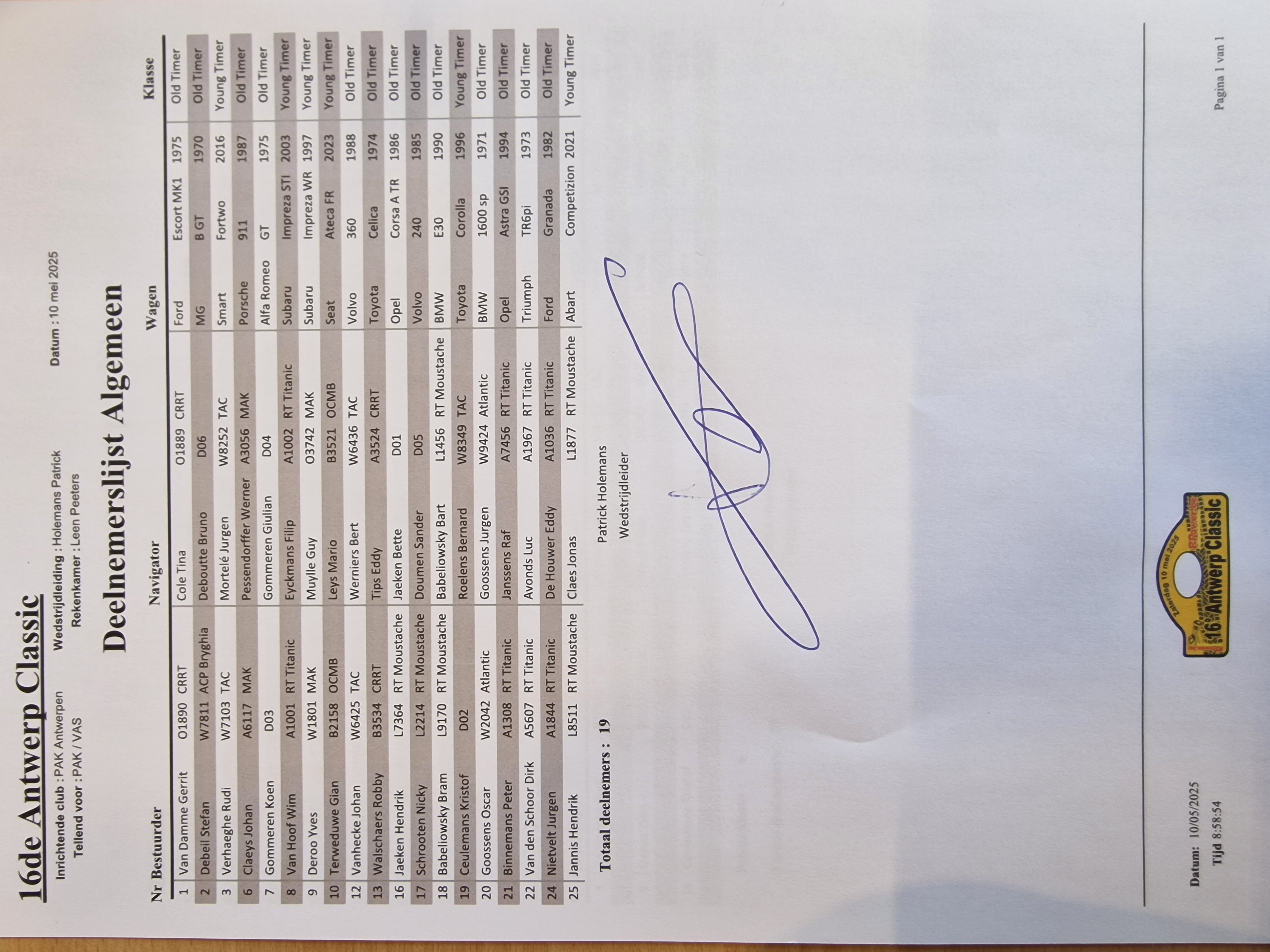 Deelnemerslijst - wagens toegelaten tot de start