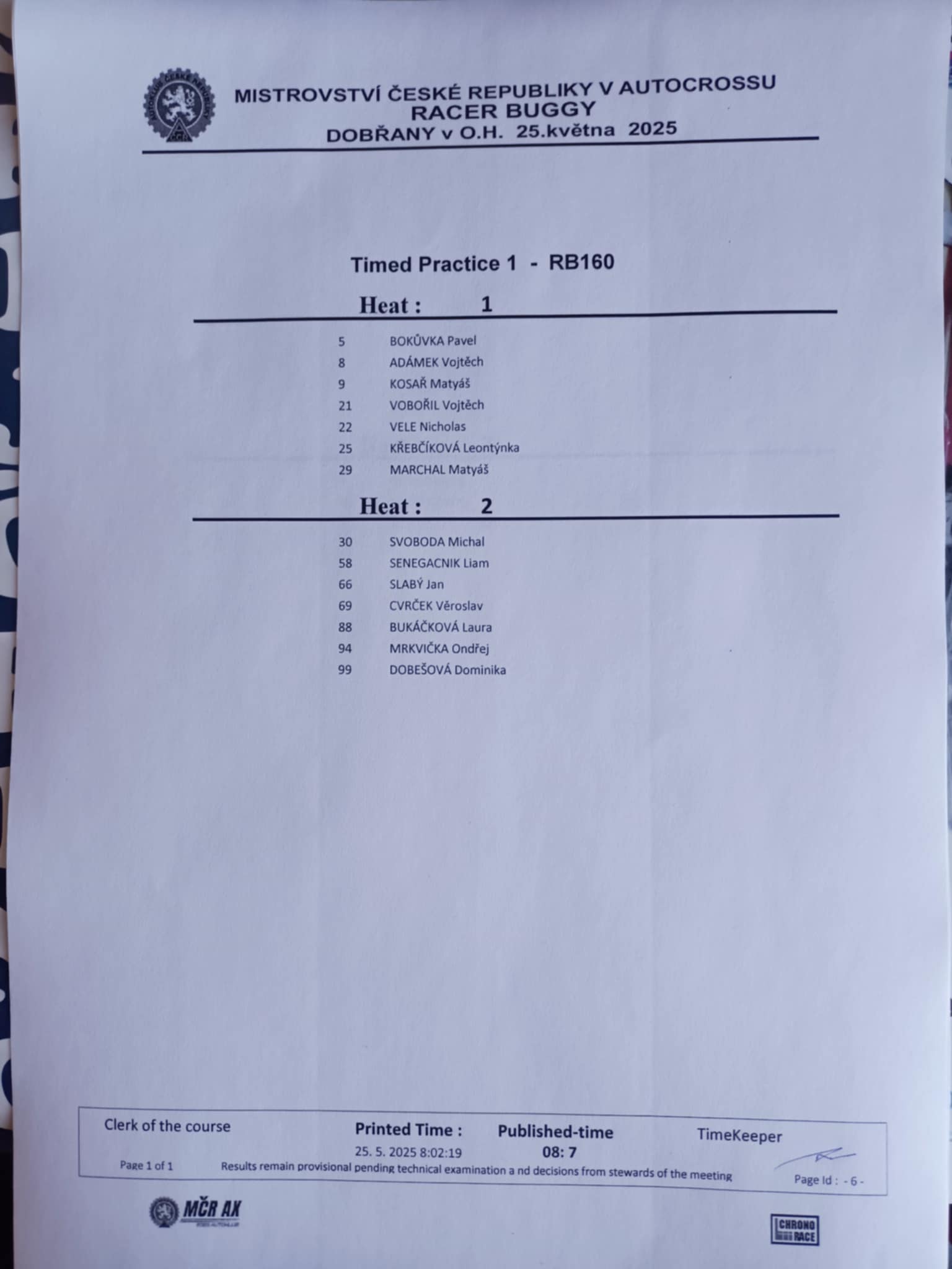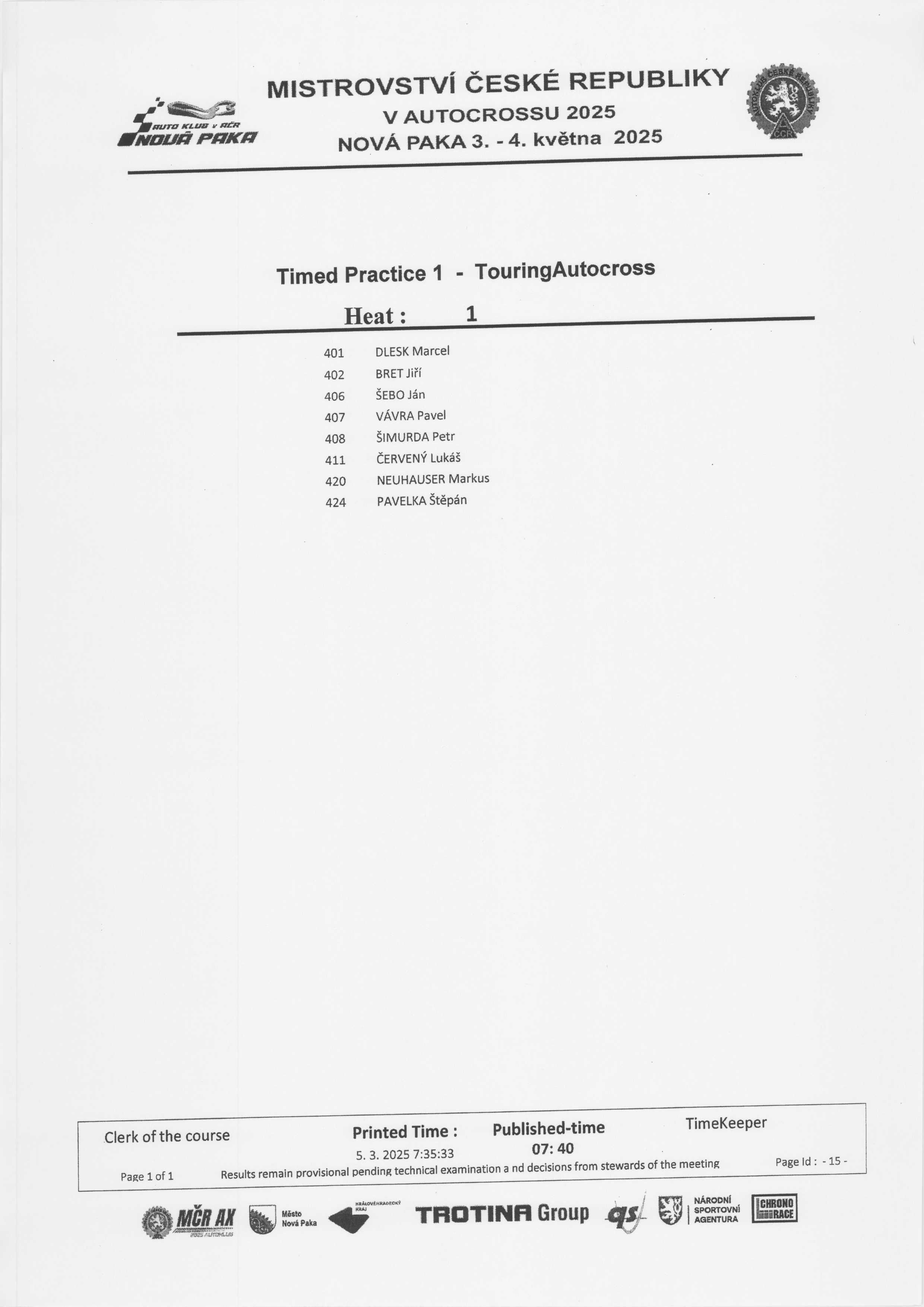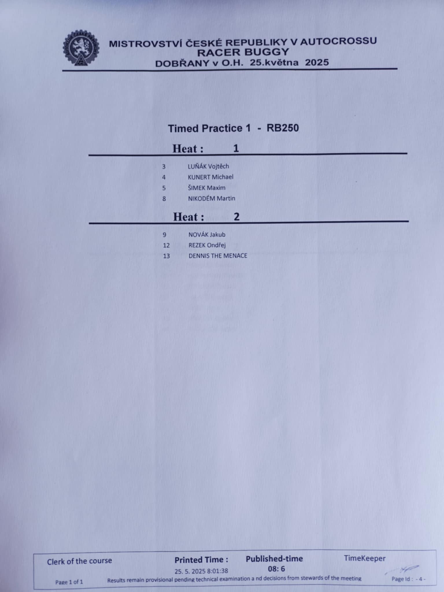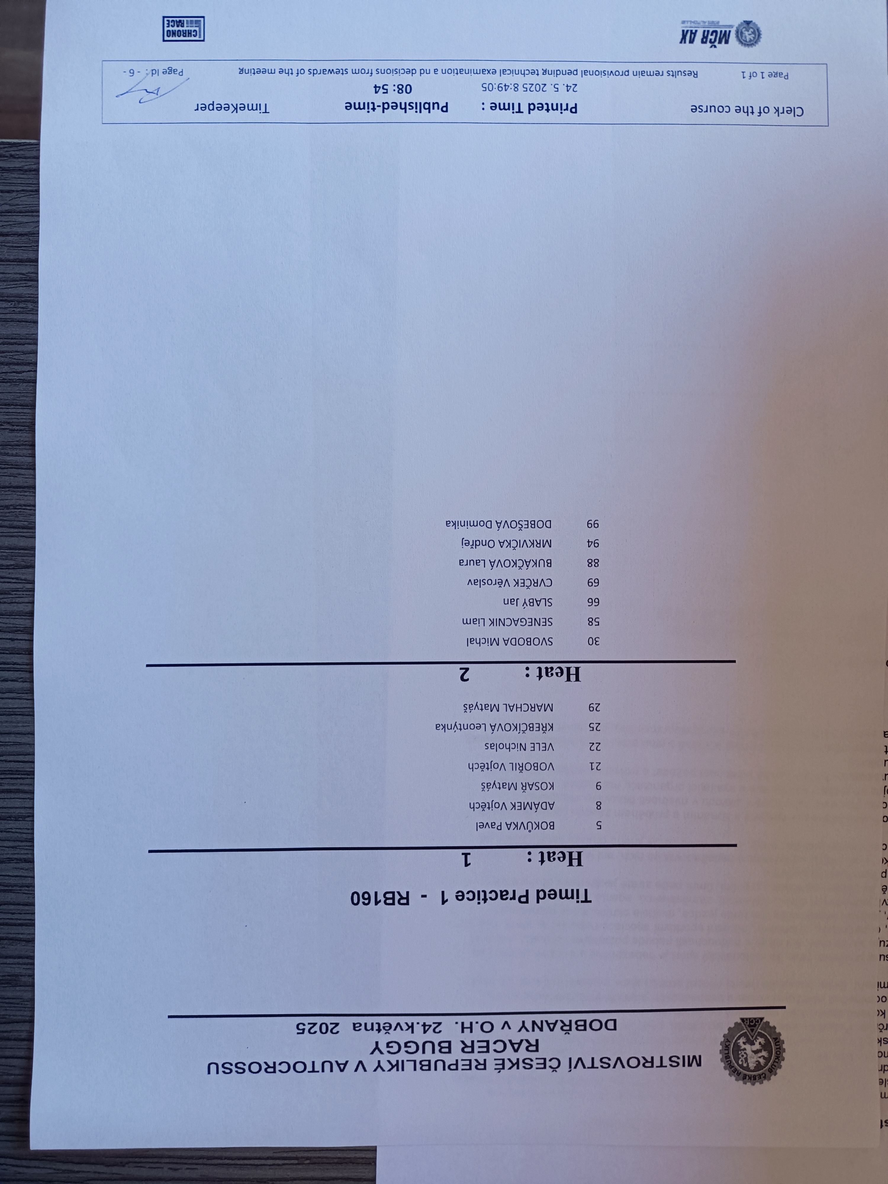 Změna časového harmonogramu na neděli 25.05. : 07:15 - 07:55 administrativní přejímka, v 08:00 rozprava a v 08:15 1. trénink