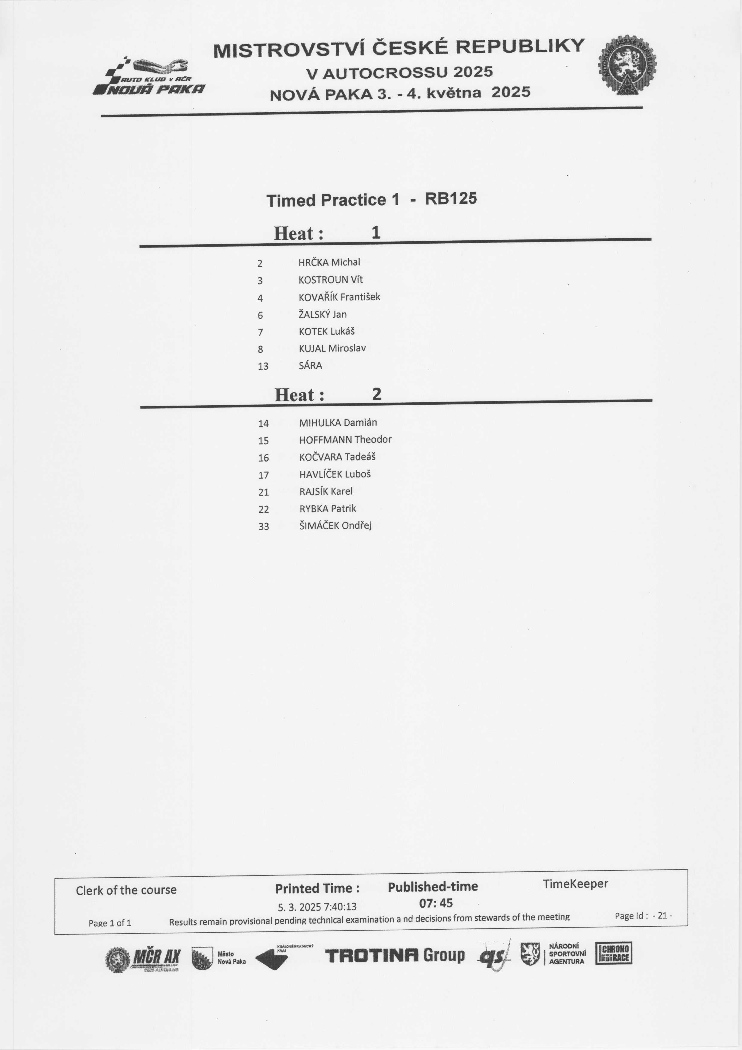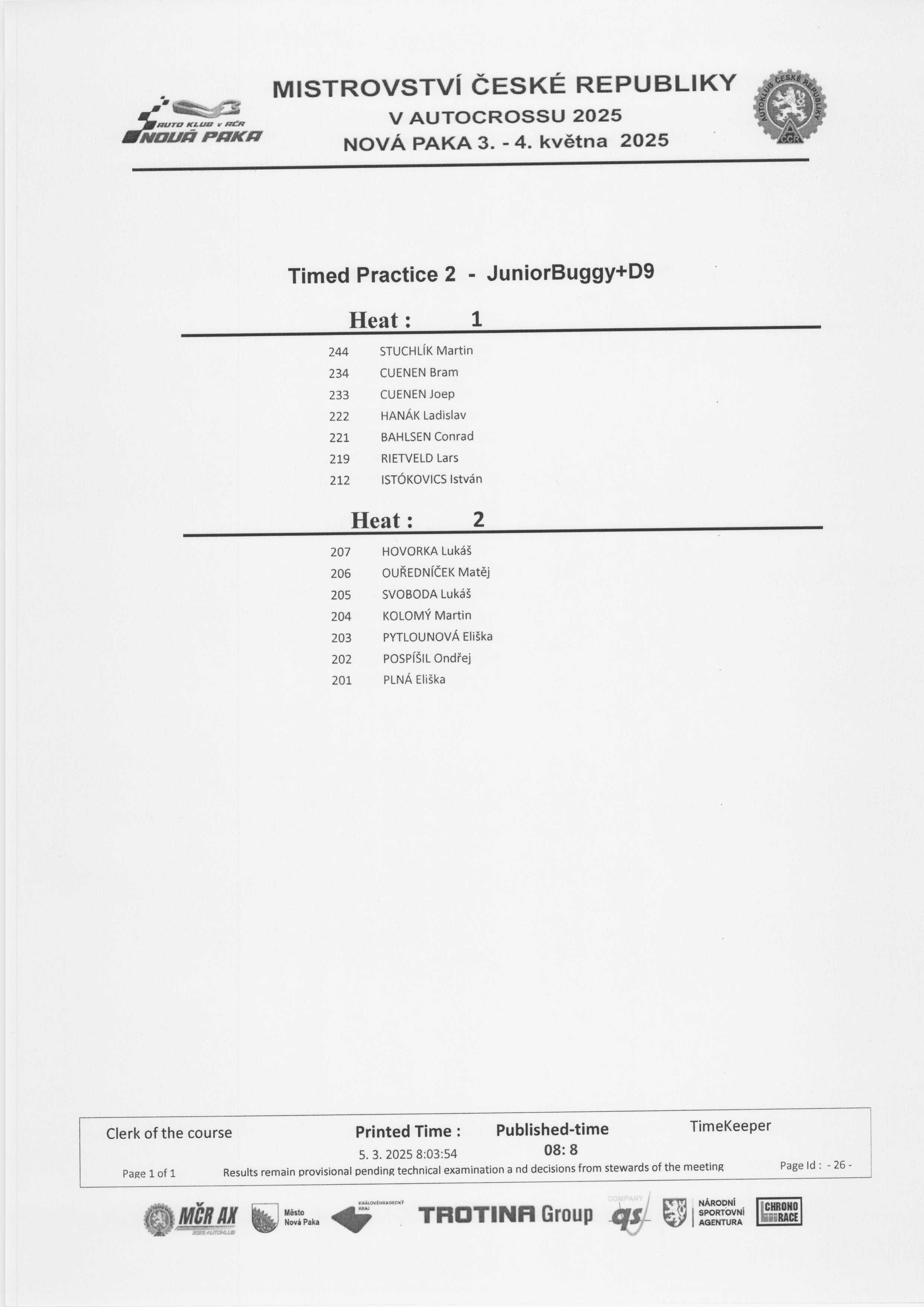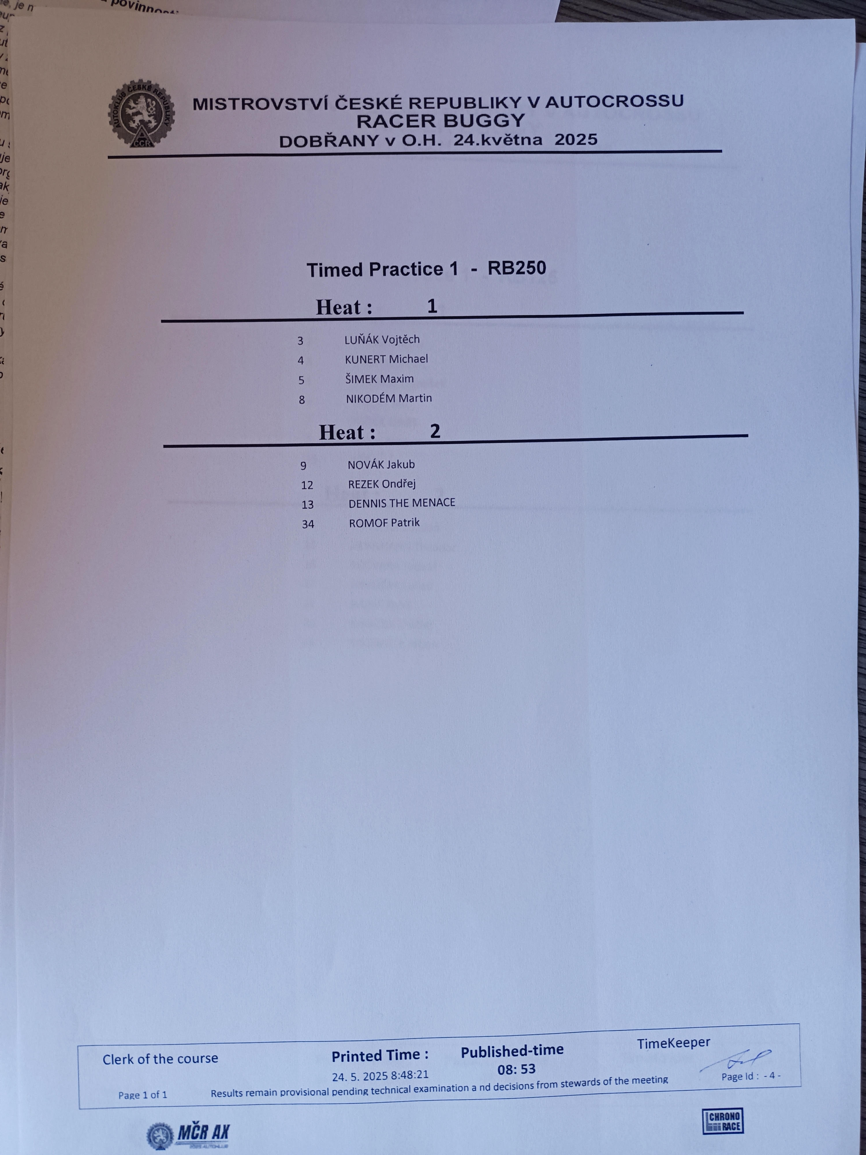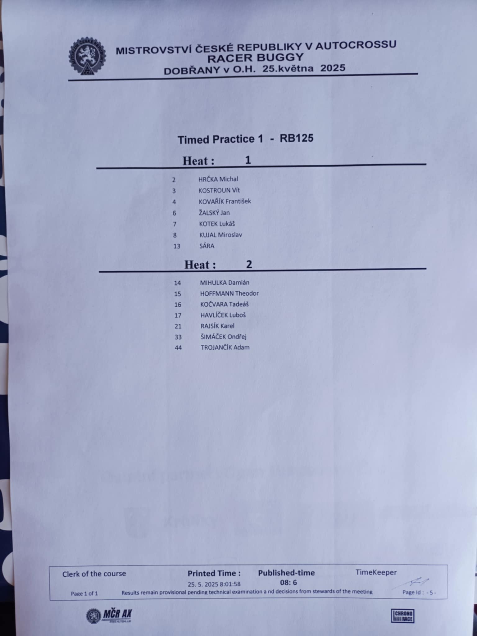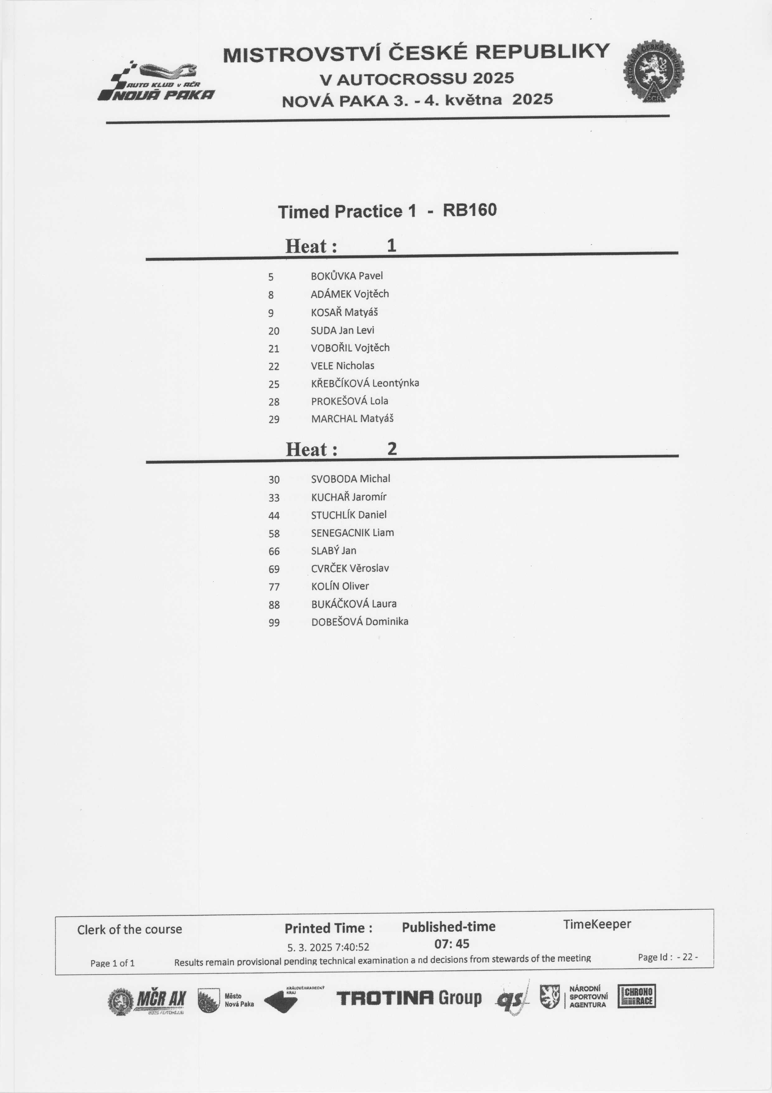 Změna časového harmonogramu na neděli 25.05. : 07:15 - 07:55 administrativní přejímka, v 08:00 rozprava a v 08:15 1. trénink