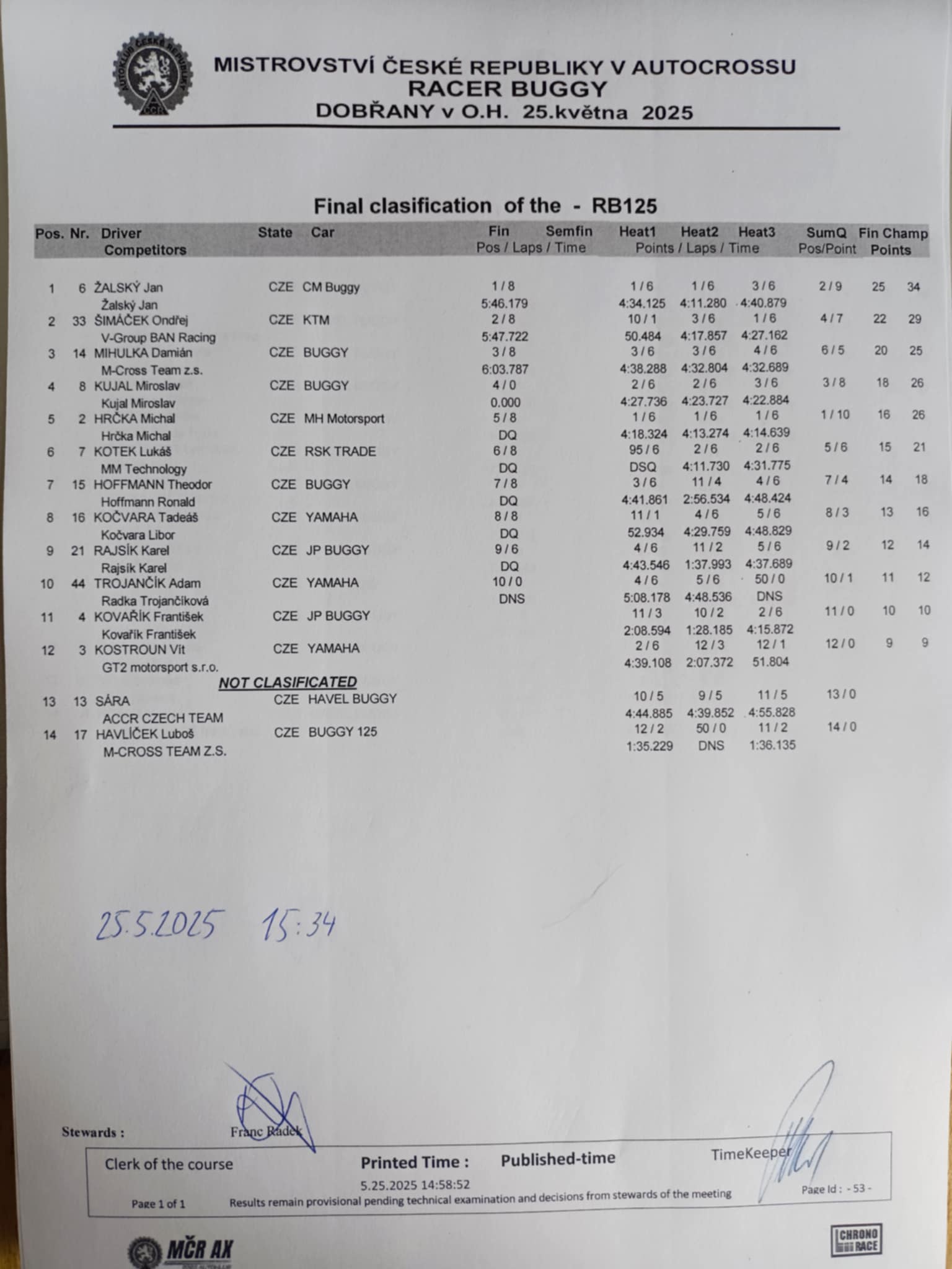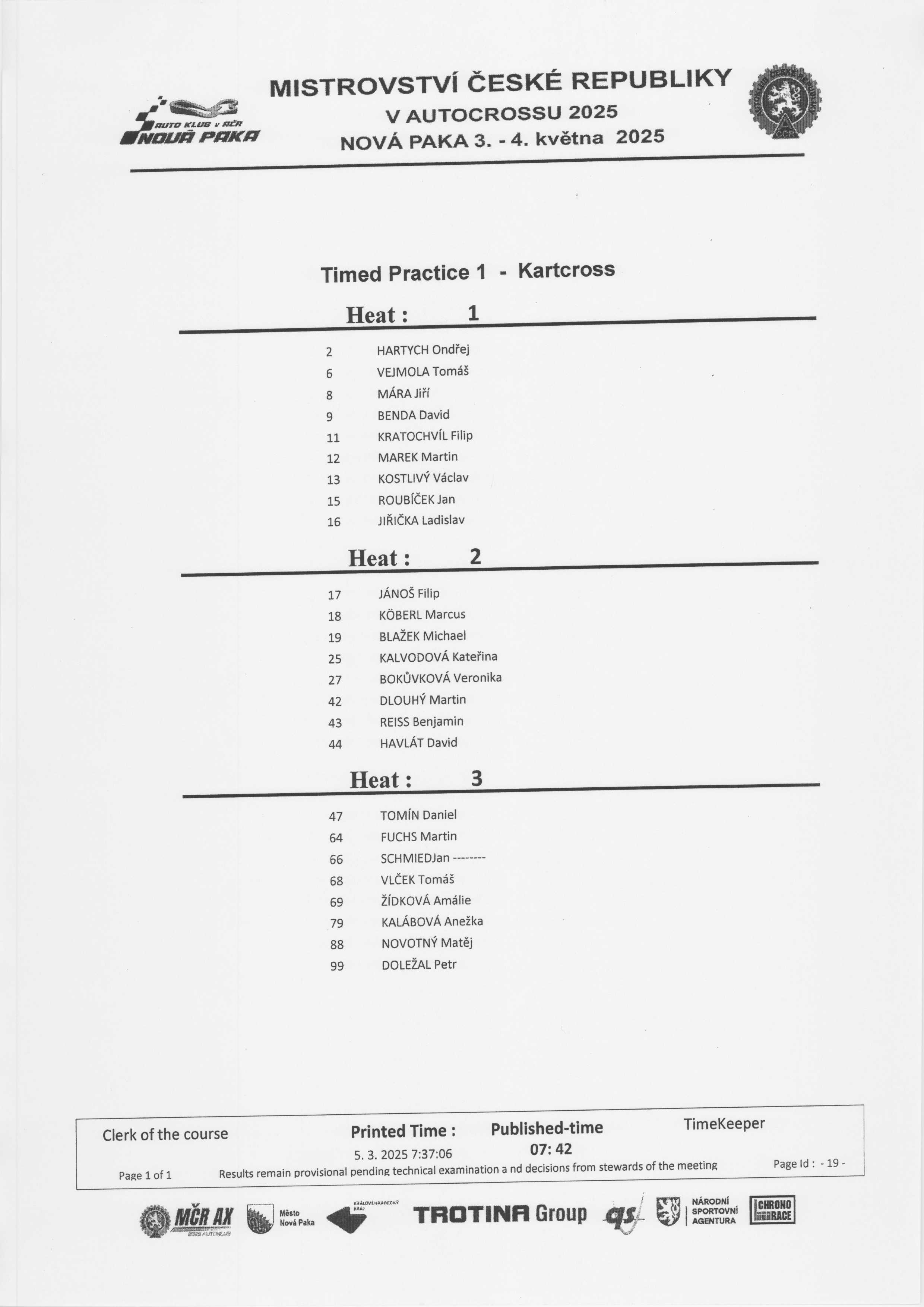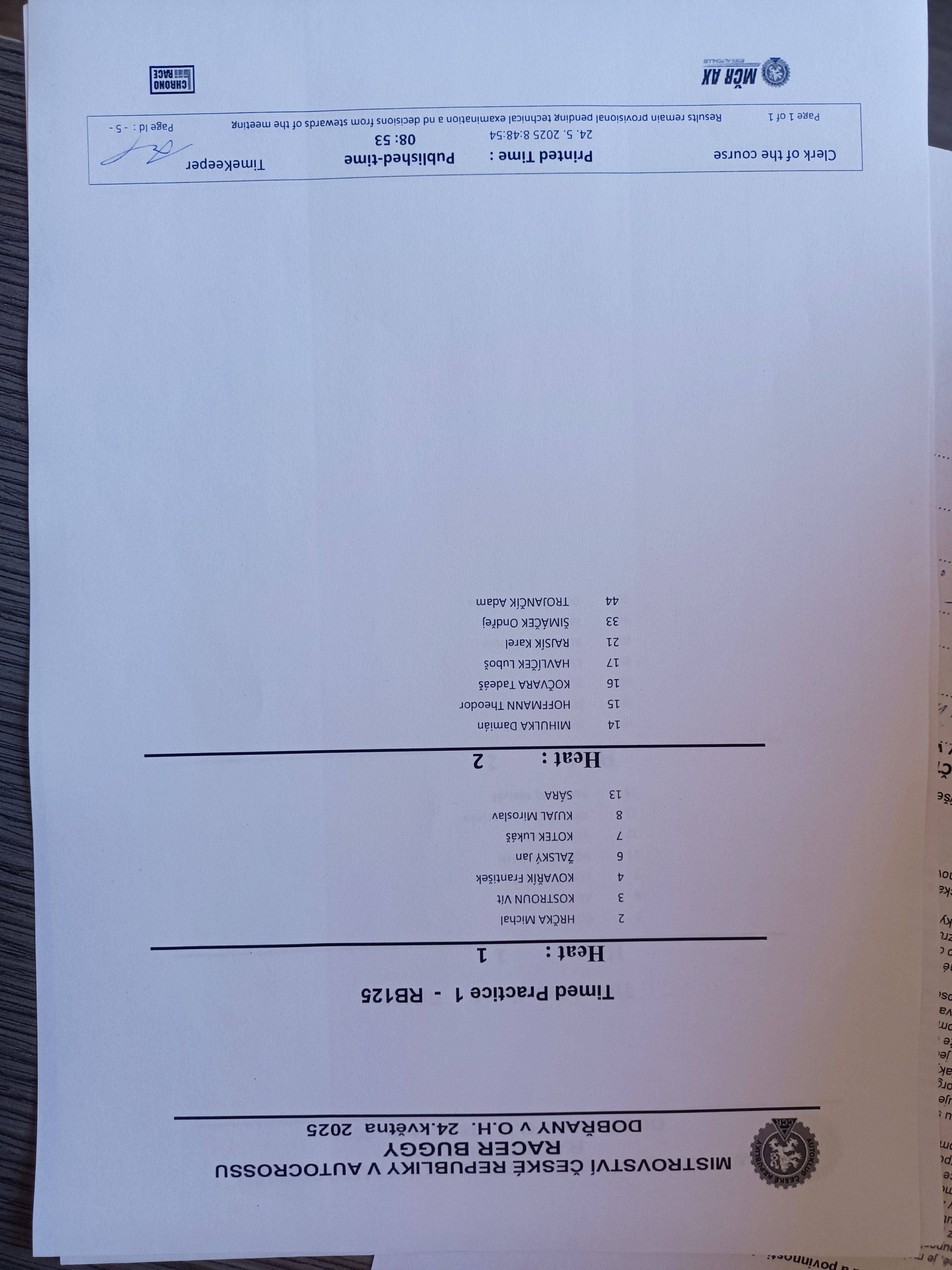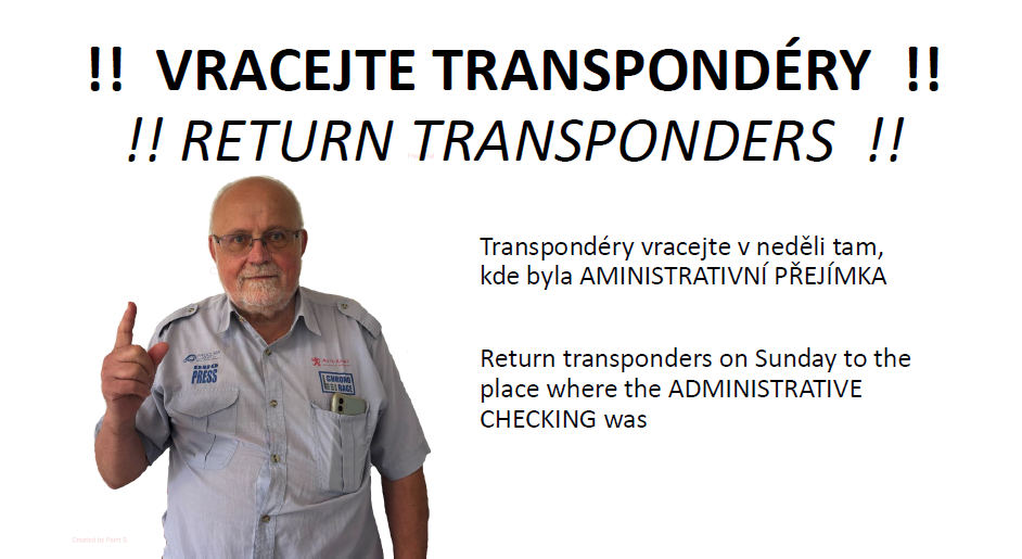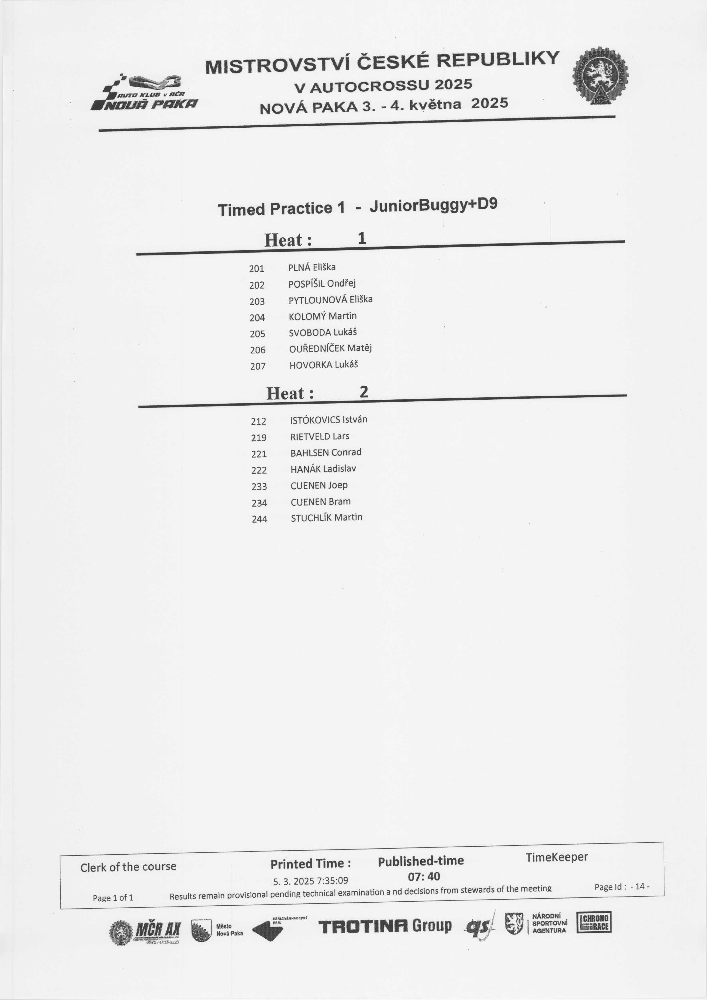 Změna časového harmonogramu na neděli 25.05. : 07:15 - 07:55 administrativní přejímka, v 08:00 rozprava a v 08:15 1. trénink