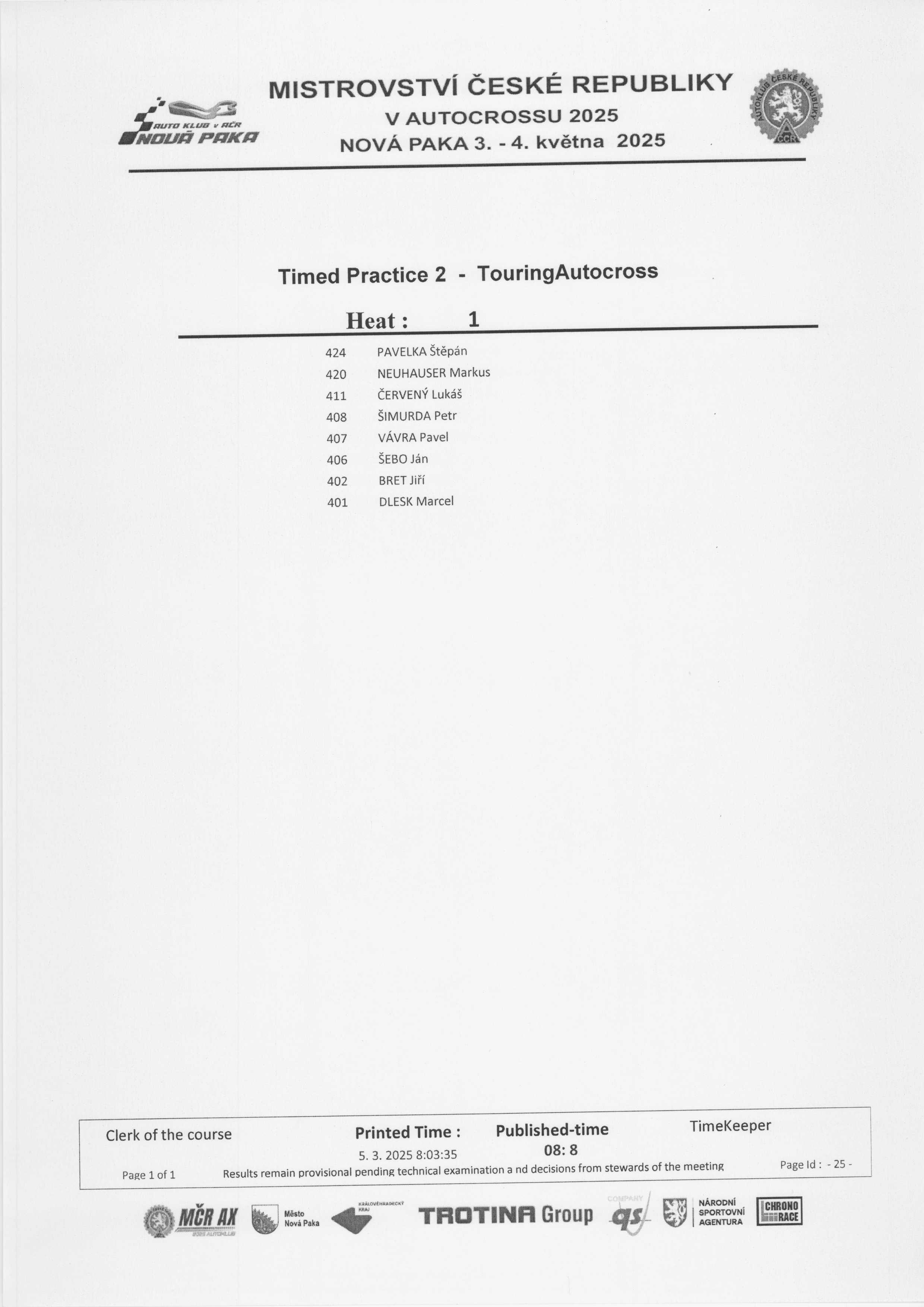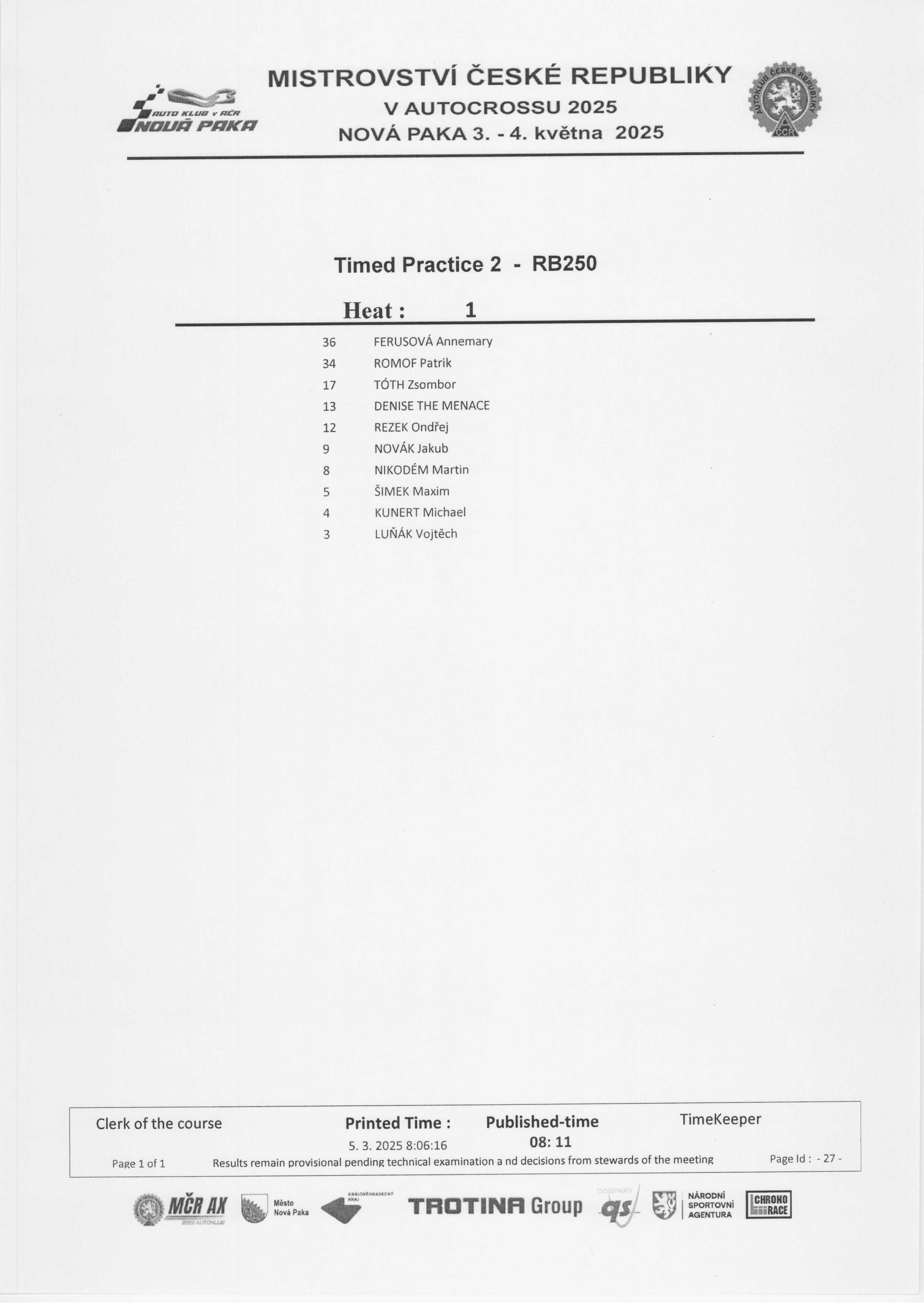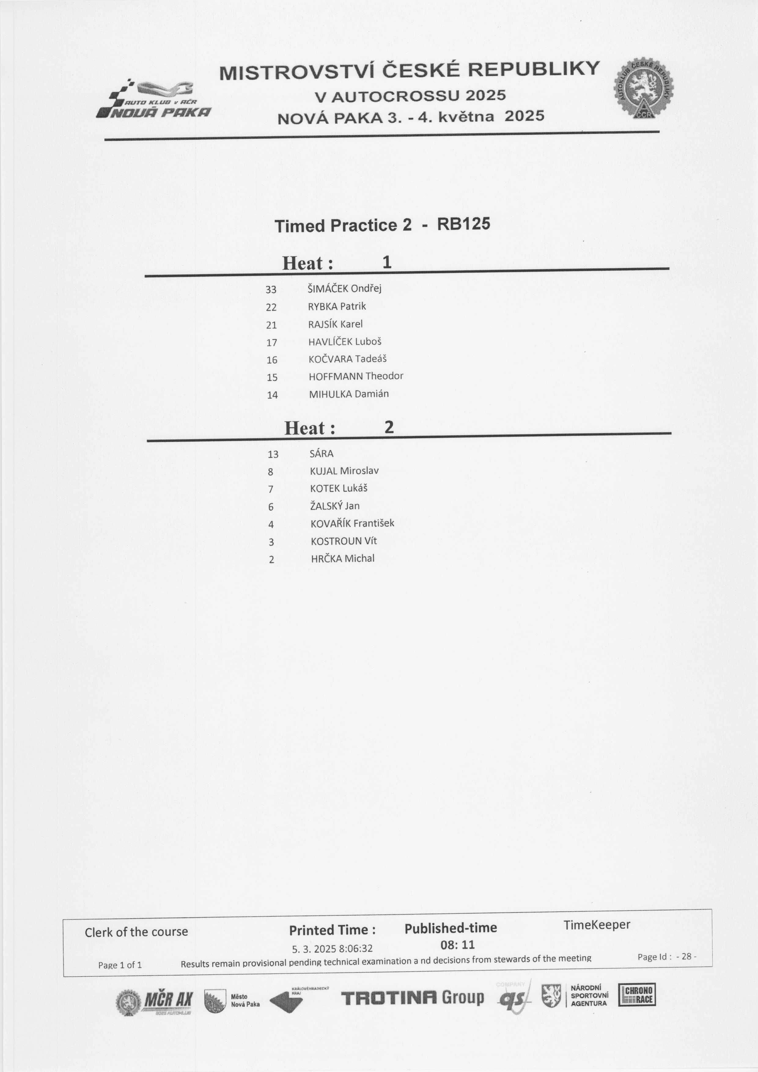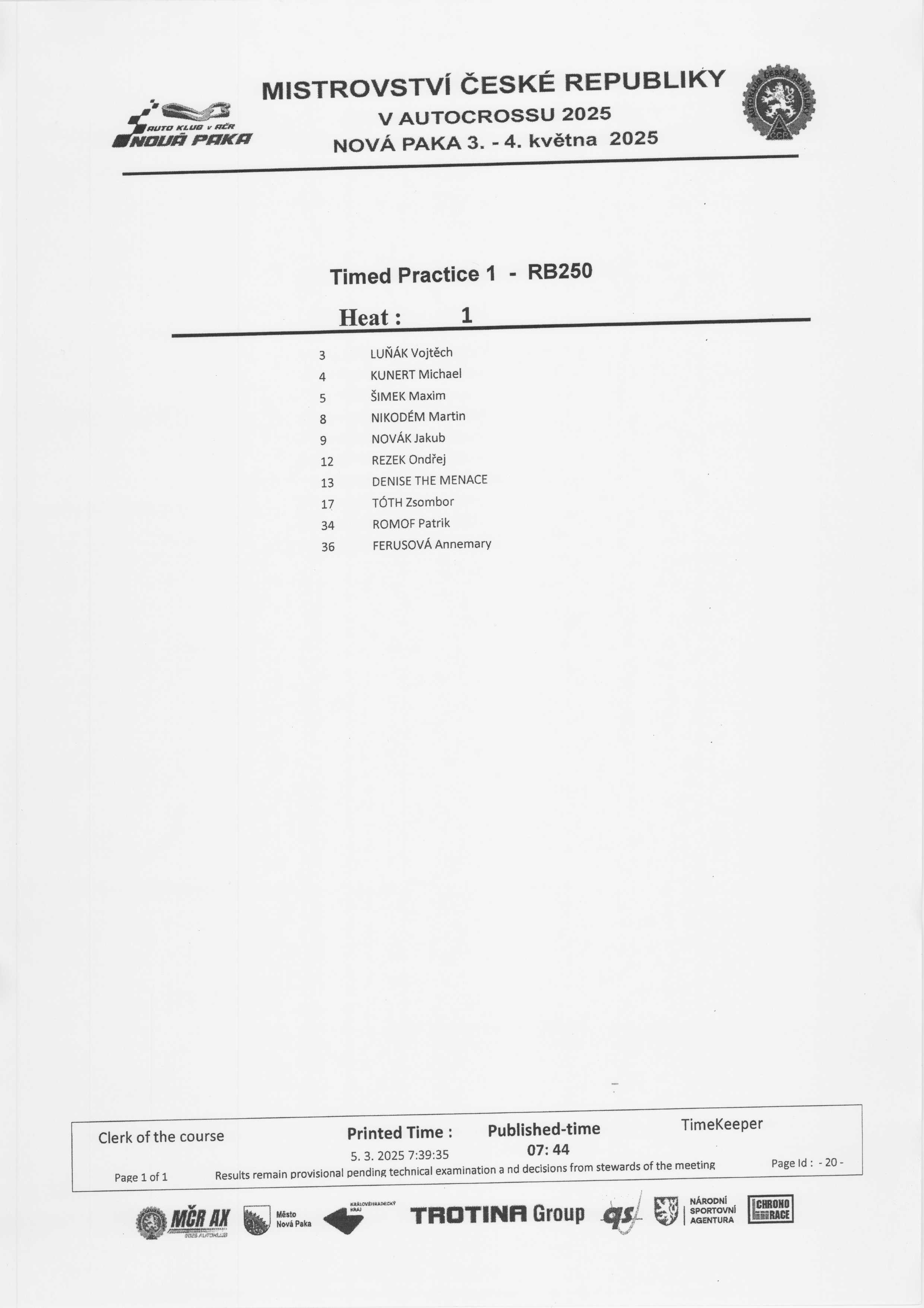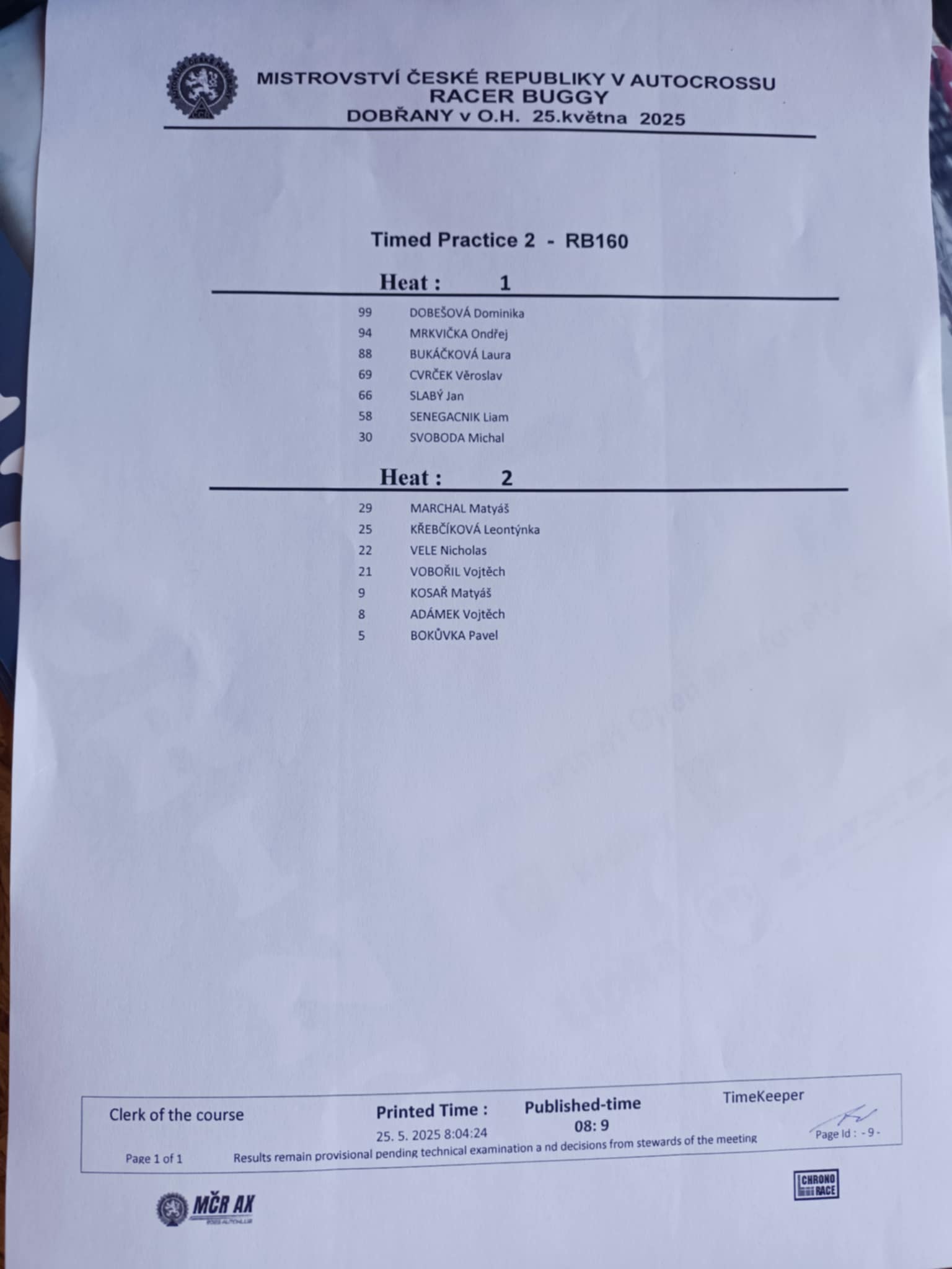Změna časového harmonogramu na neděli 25.05. : 07:15 - 07:55 administrativní přejímka, v 08:00 rozprava a v 08:15 1. trénink