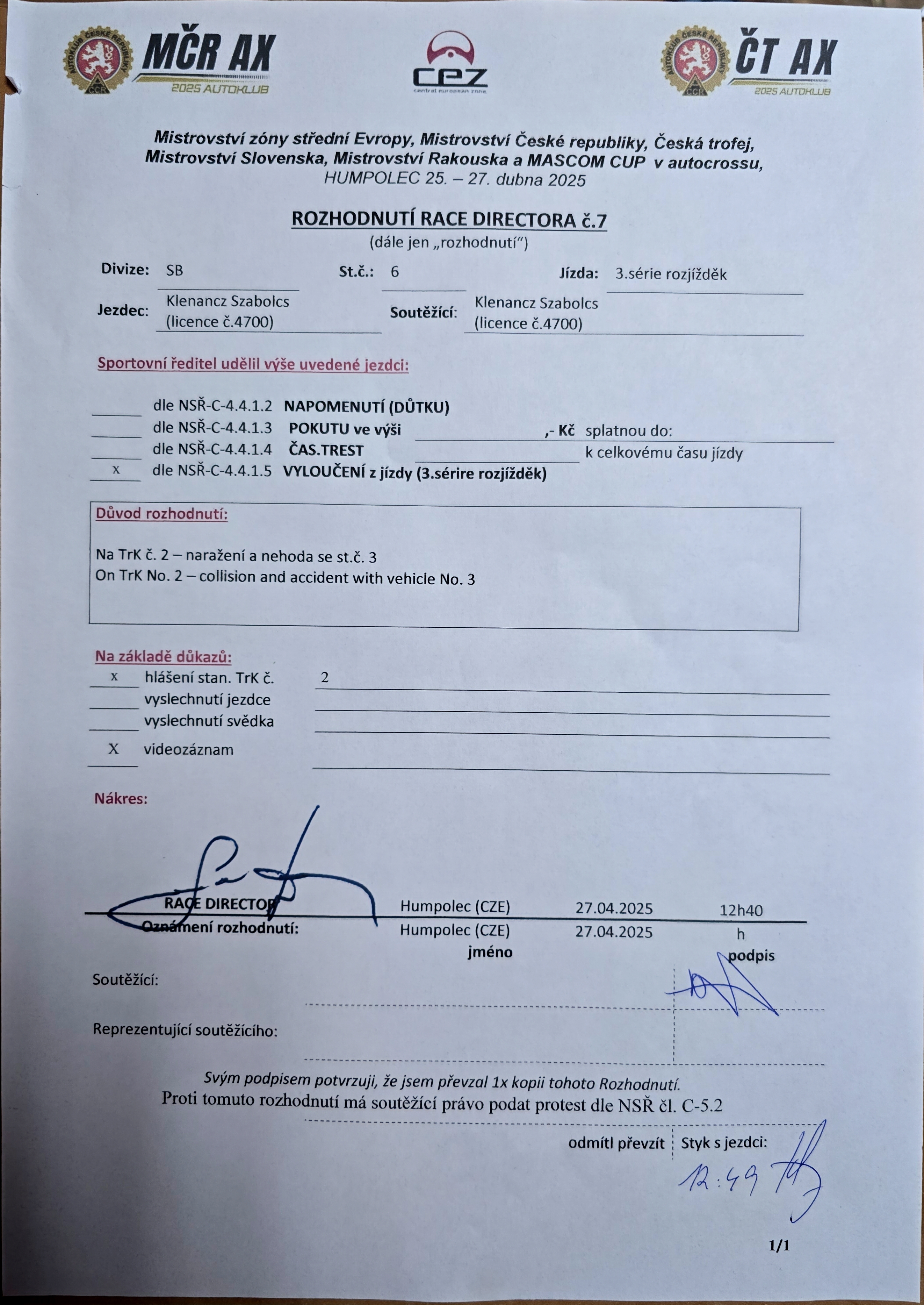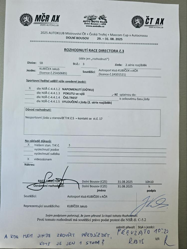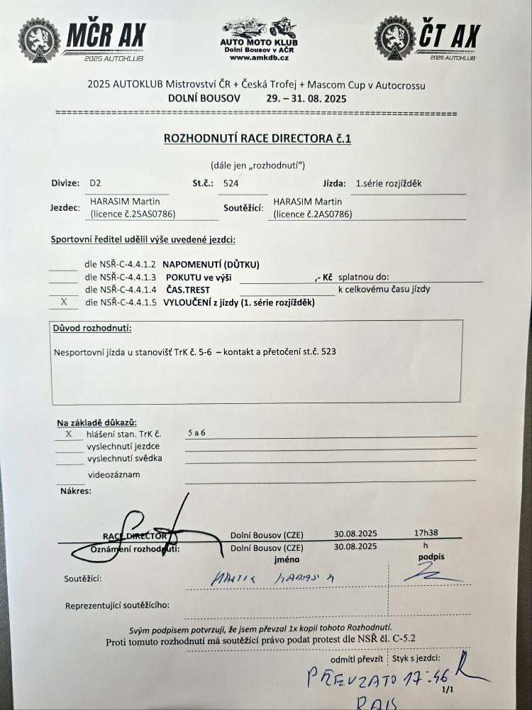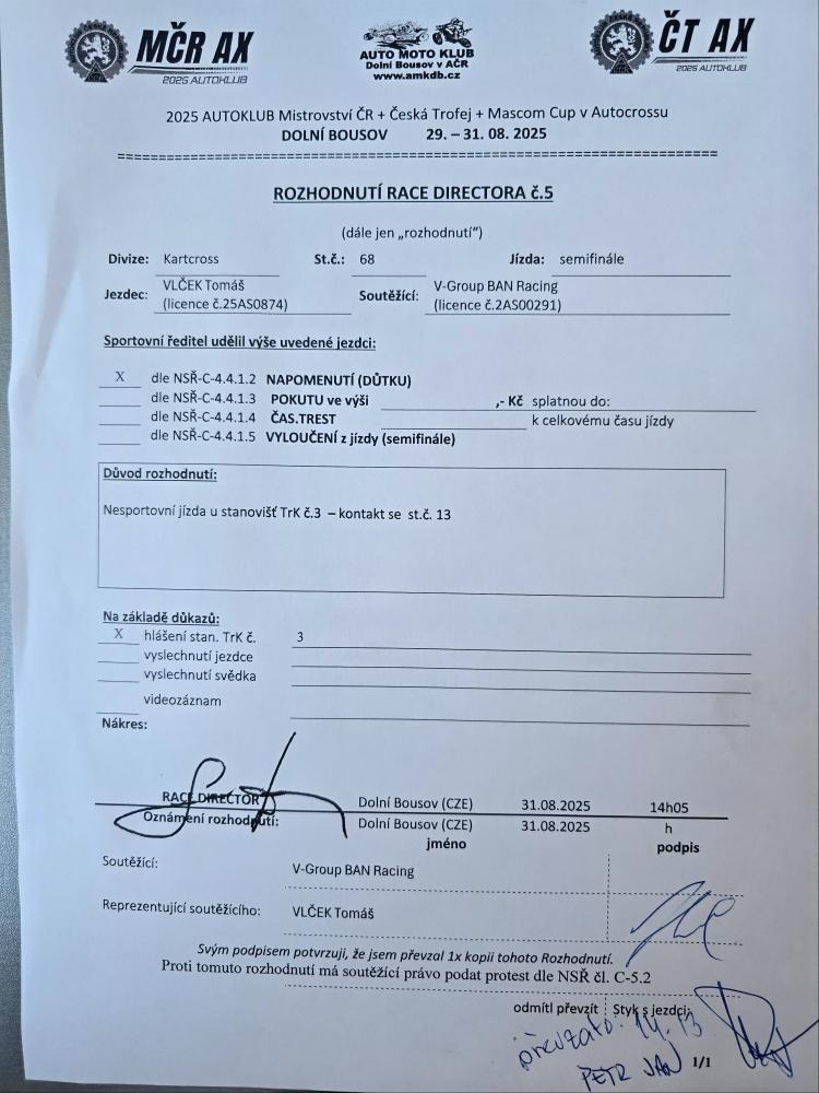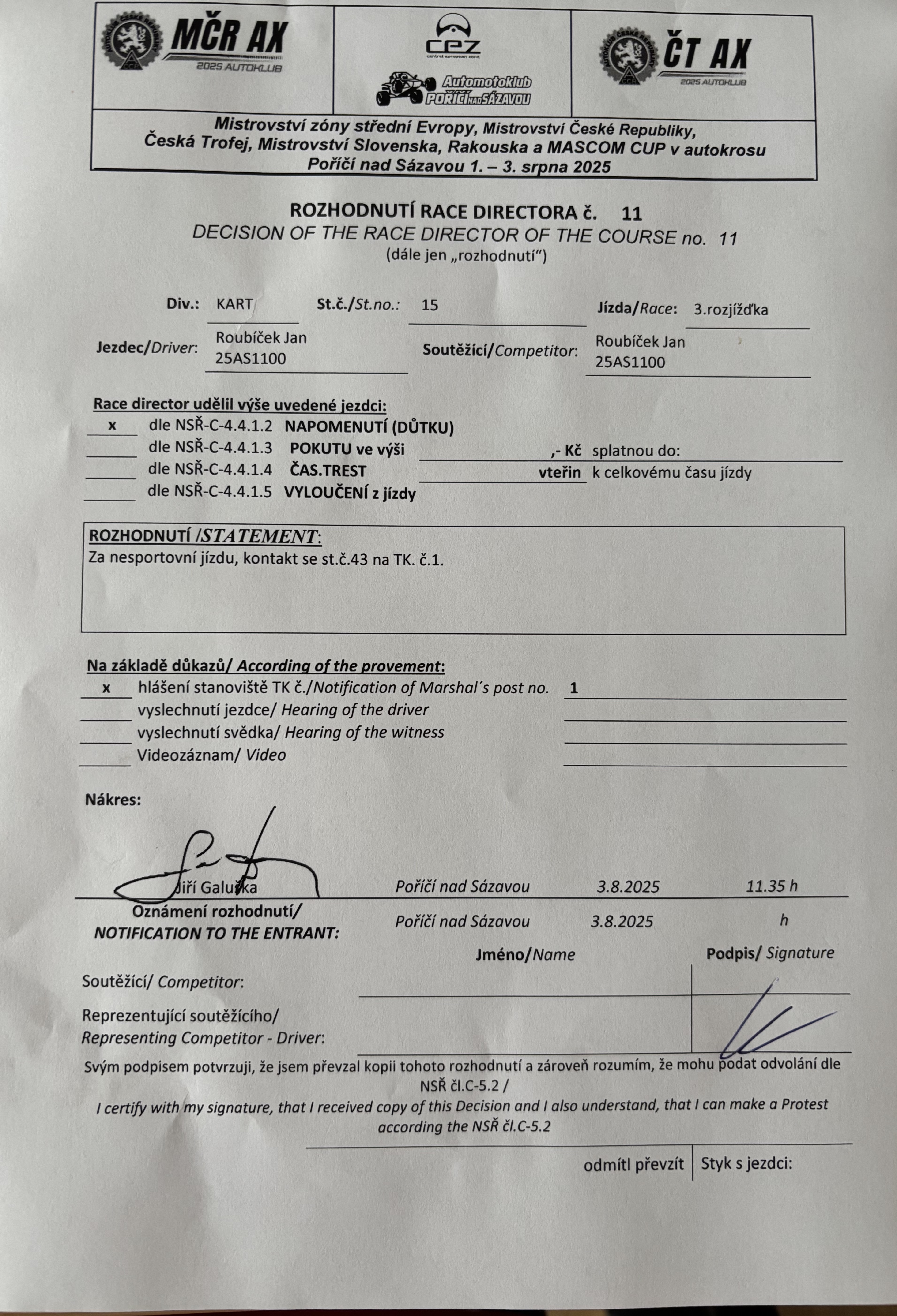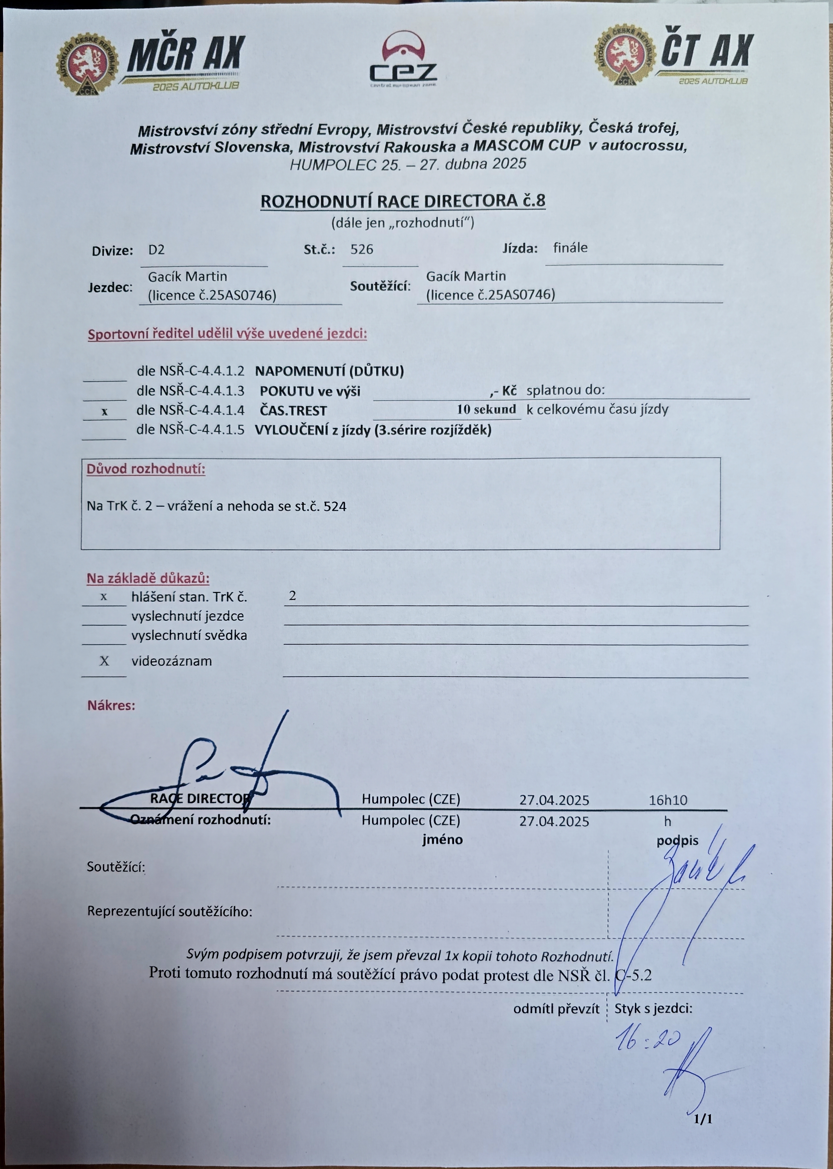 Rozhodnutí Race Direktora č. 8 - #68 Kartcross