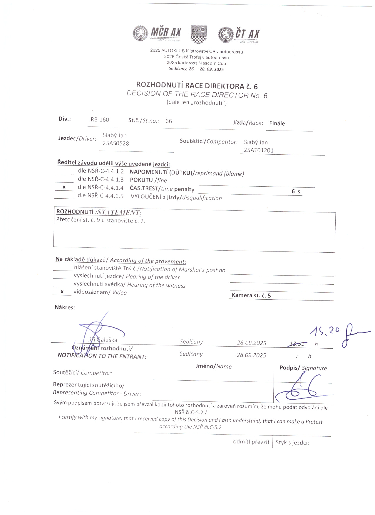 Rozhodnutí Race Direktora č. 6 - #66 RB160