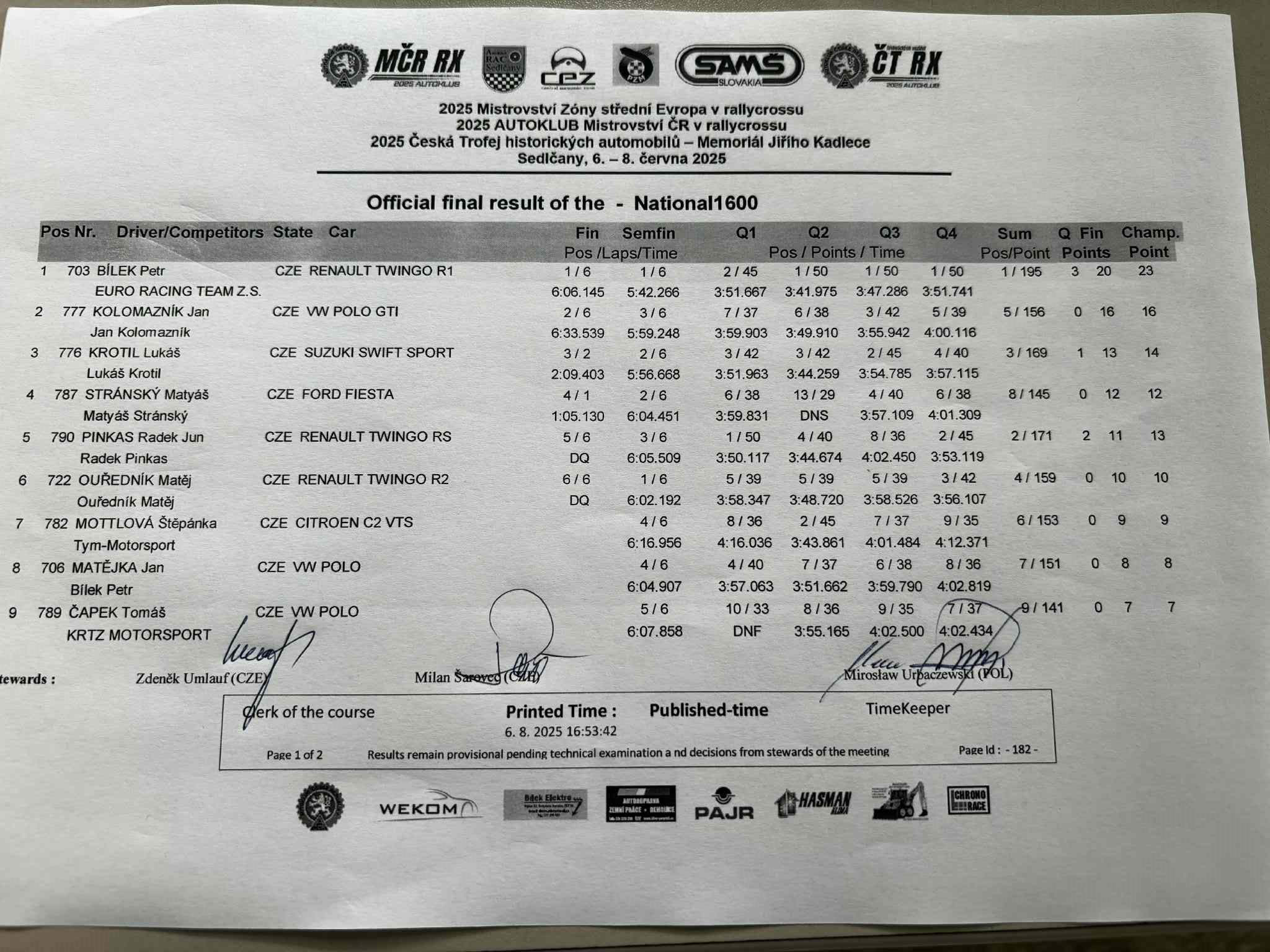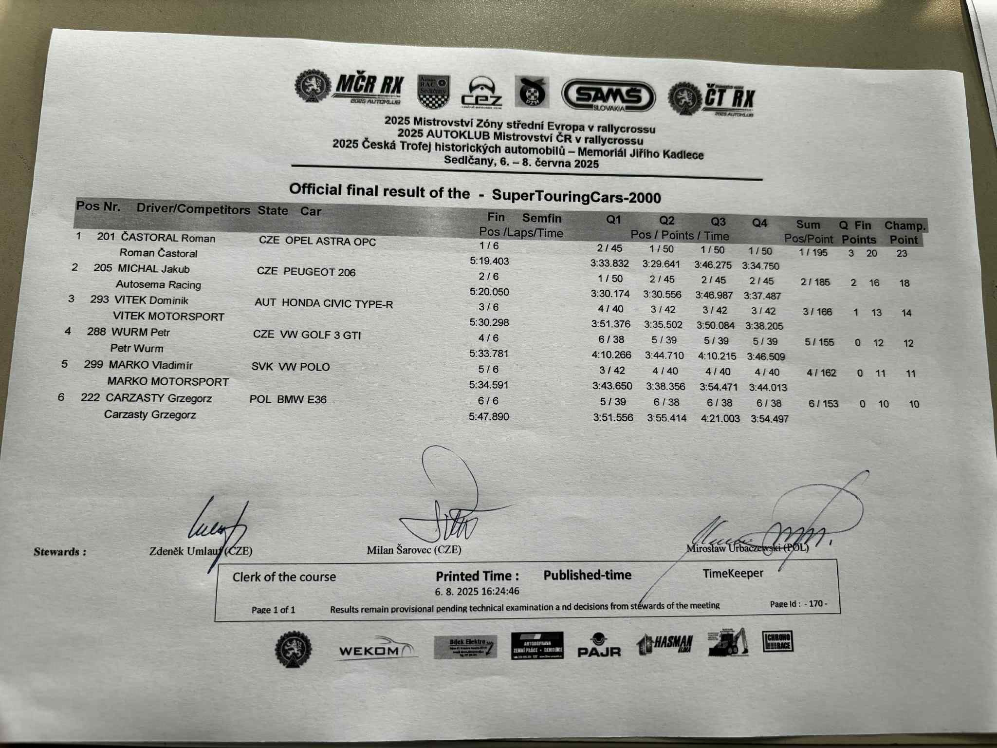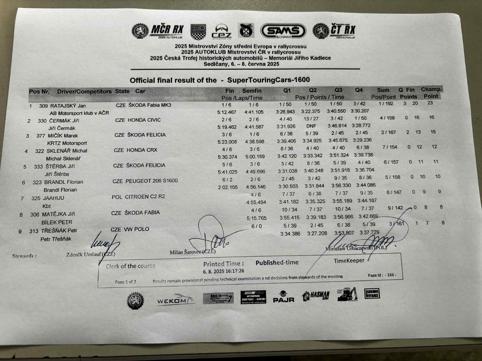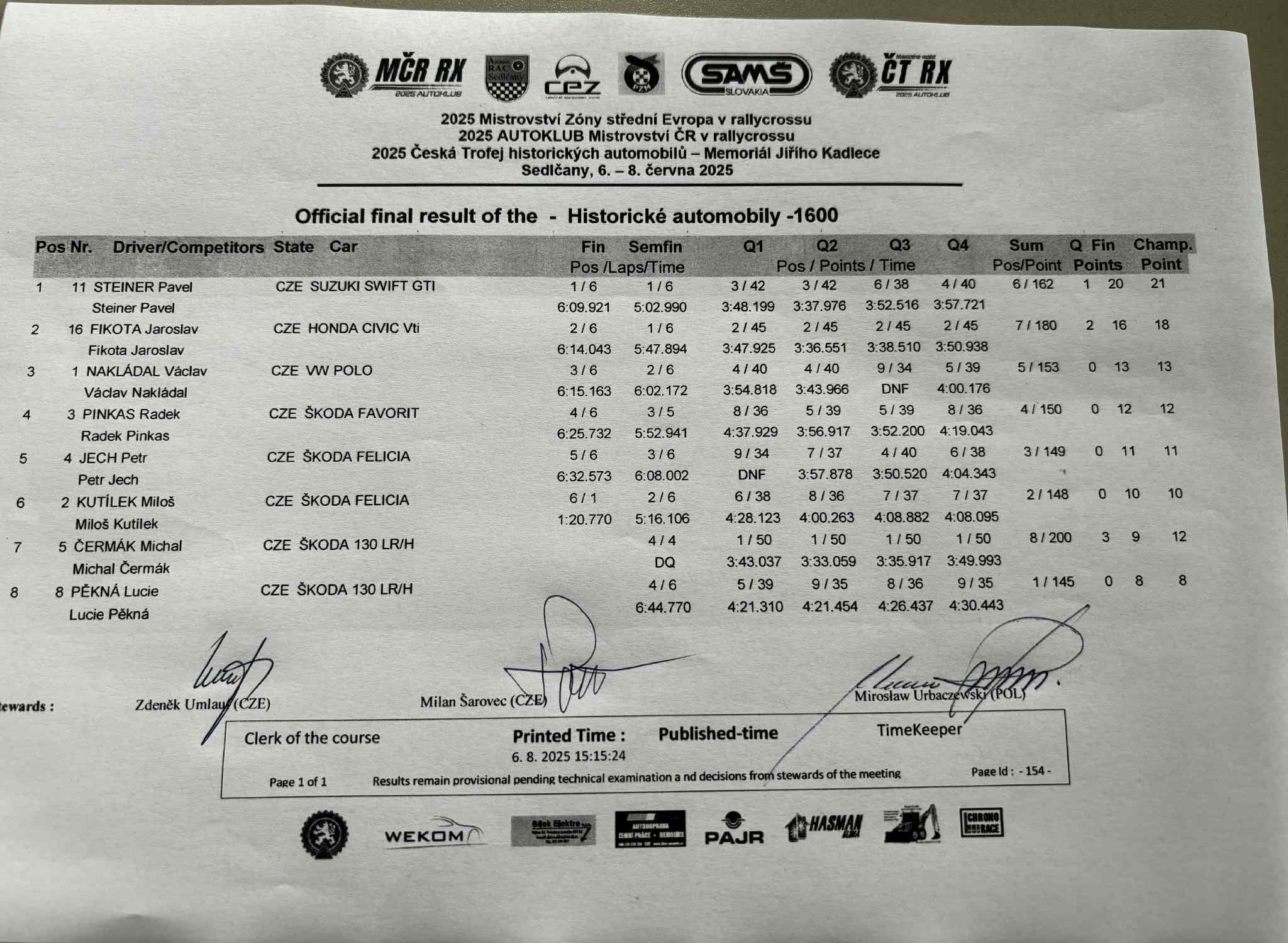 Sobotní program bude končit Q3 divizí N1600 CZE, divize STC startují ráno / Saturday's program will end with Q3 of the N1600 CZE division, STC divisions start in the morning