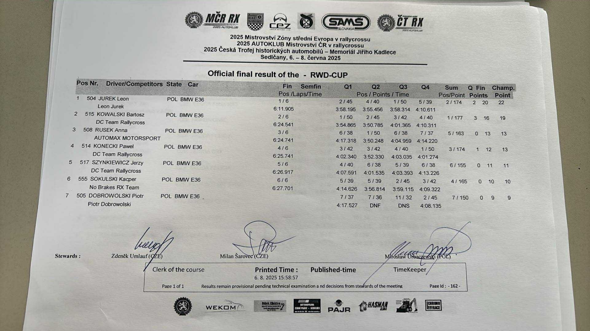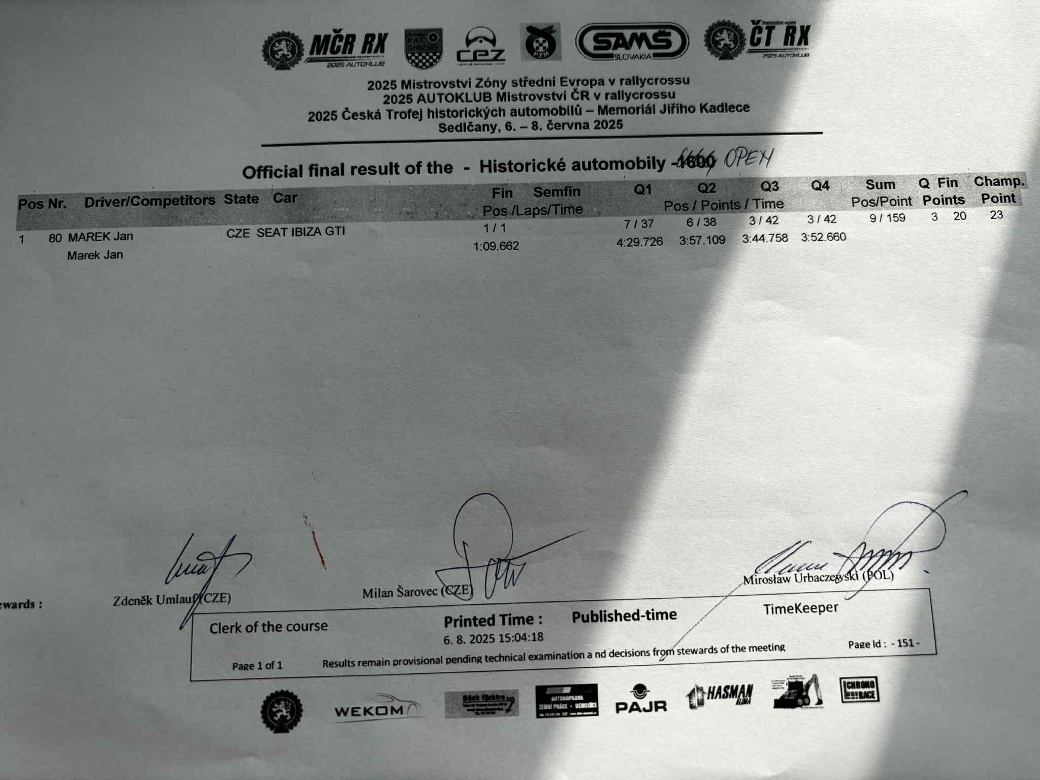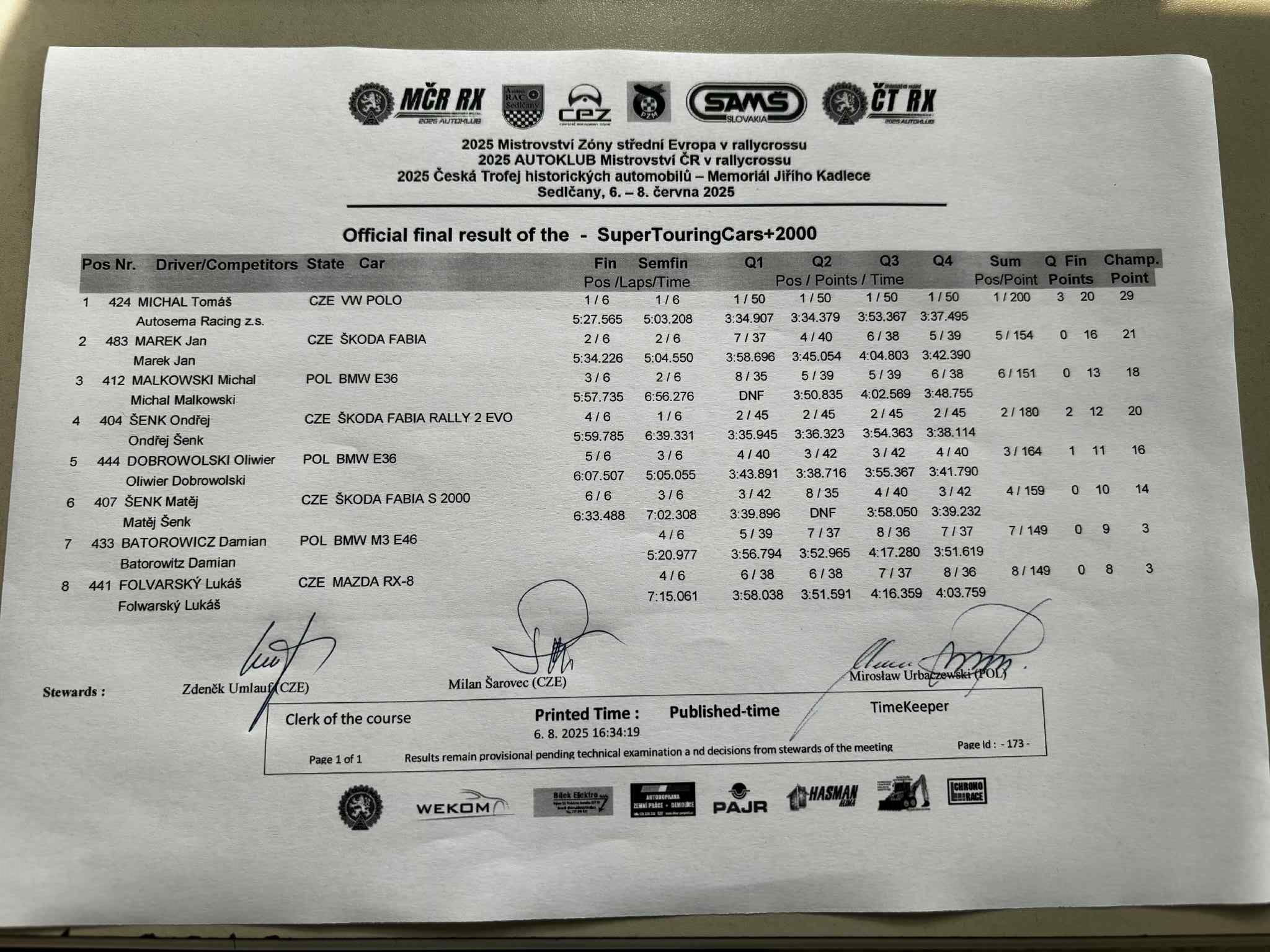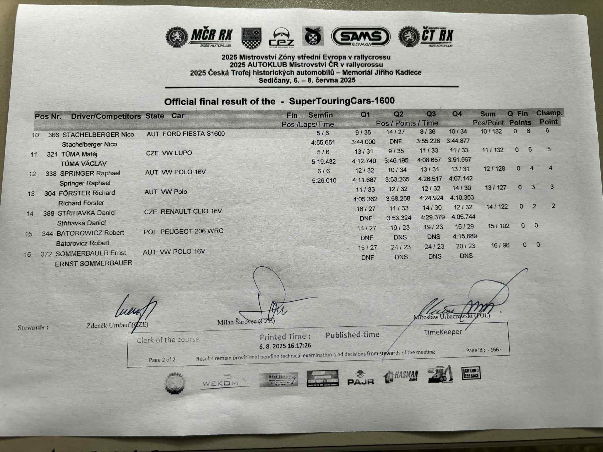 Sobotní program bude končit Q3 divizí N1600 CZE, divize STC startují ráno / Saturday's program will end with Q3 of the N1600 CZE division, STC divisions start in the morning