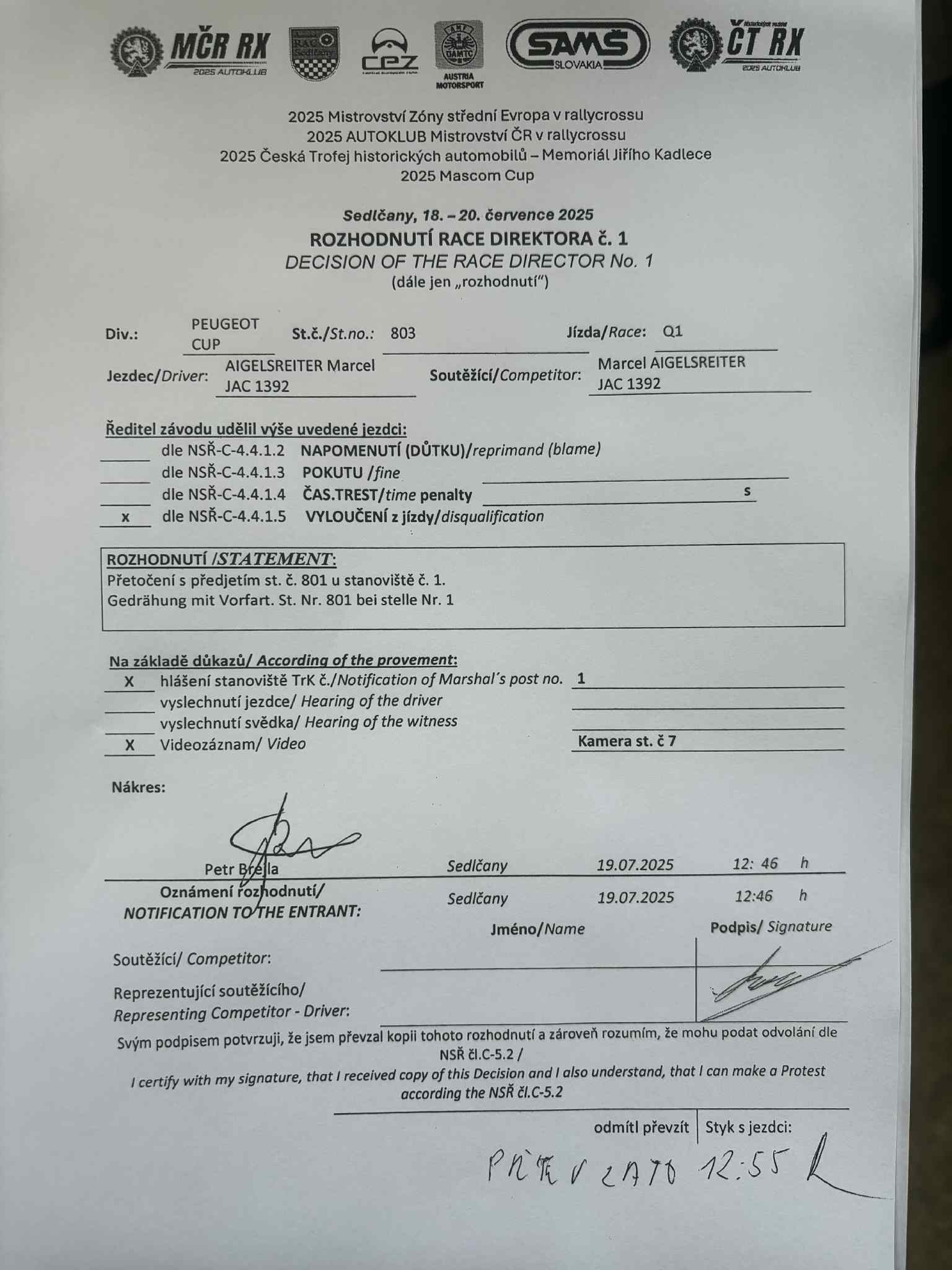 Rozhodnutí - 1 / Decision - 1 #803 PEUGEOT CUP