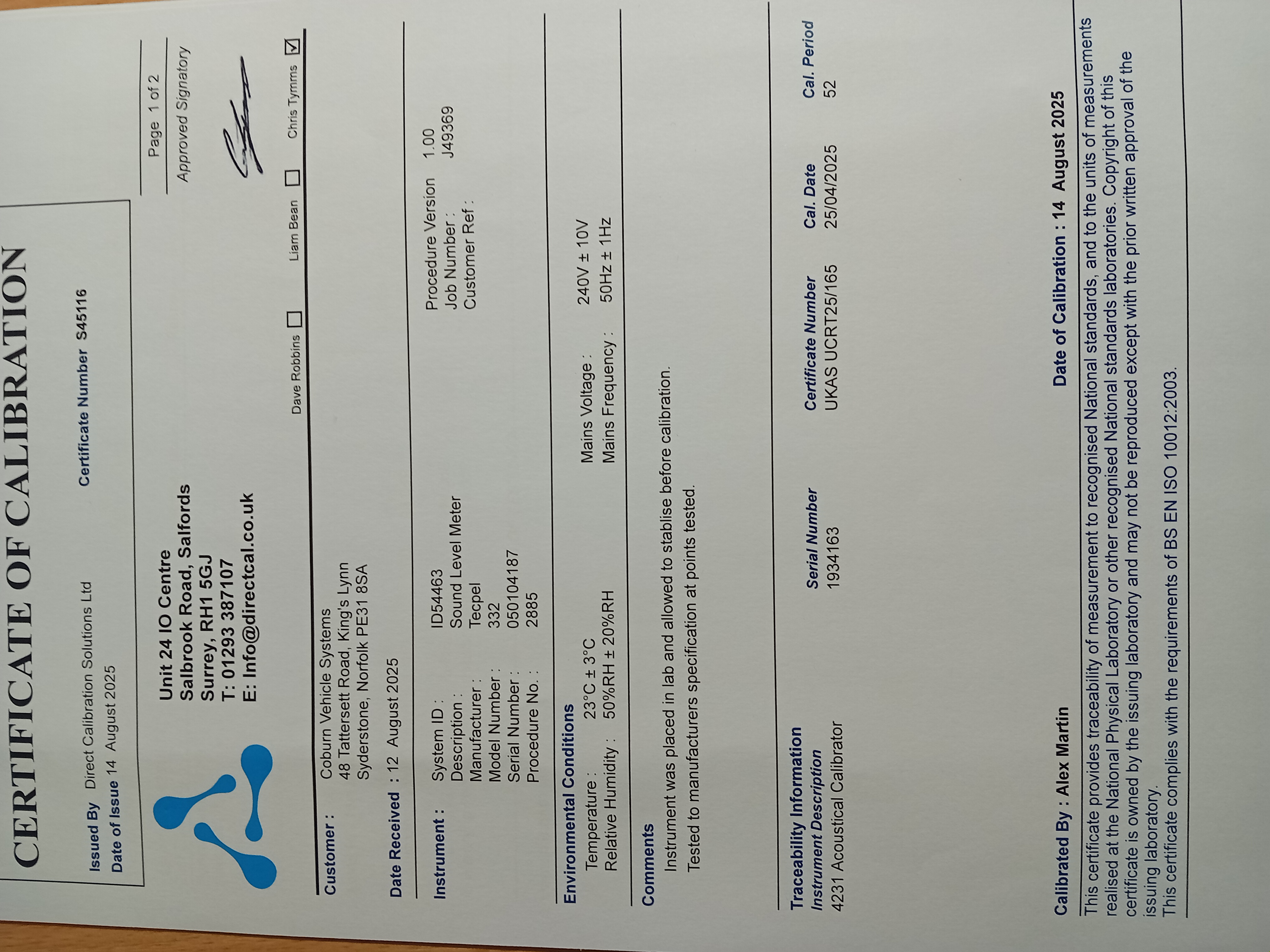 Noise Meter Calibration Certificate