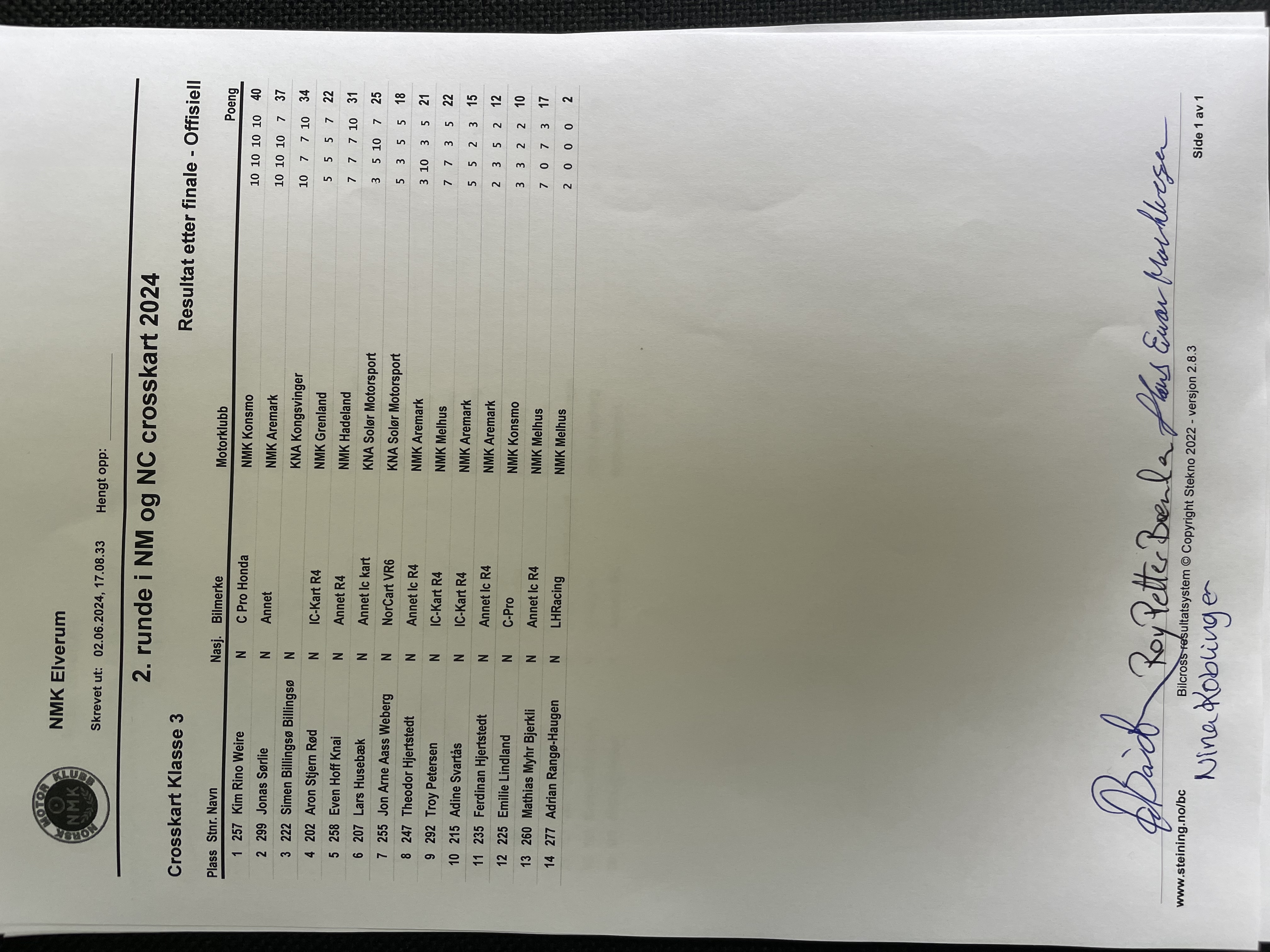 Heatoppsett og resultater Crosskart Klasse 3